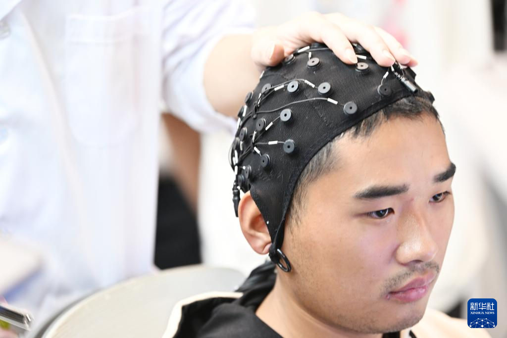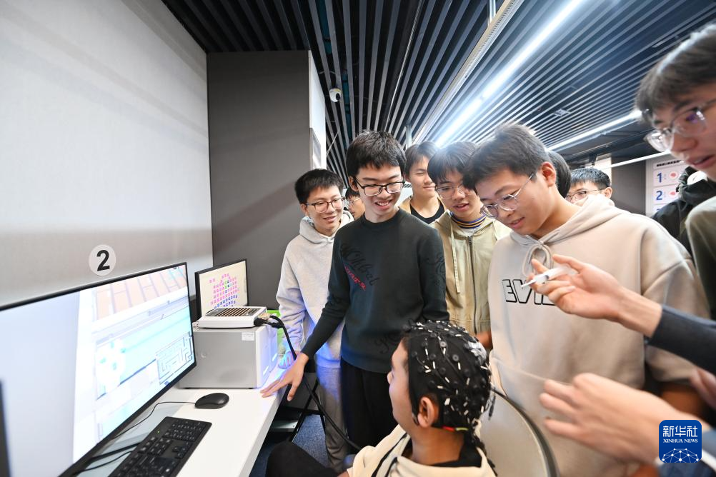 在天津大学脑控系统研发与集成应用实验室,学生佩戴脑电帽(11月15日摄)。