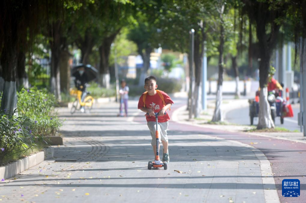11月17日,小朋友在广州一公园旁的人行道上滑滑板车。
