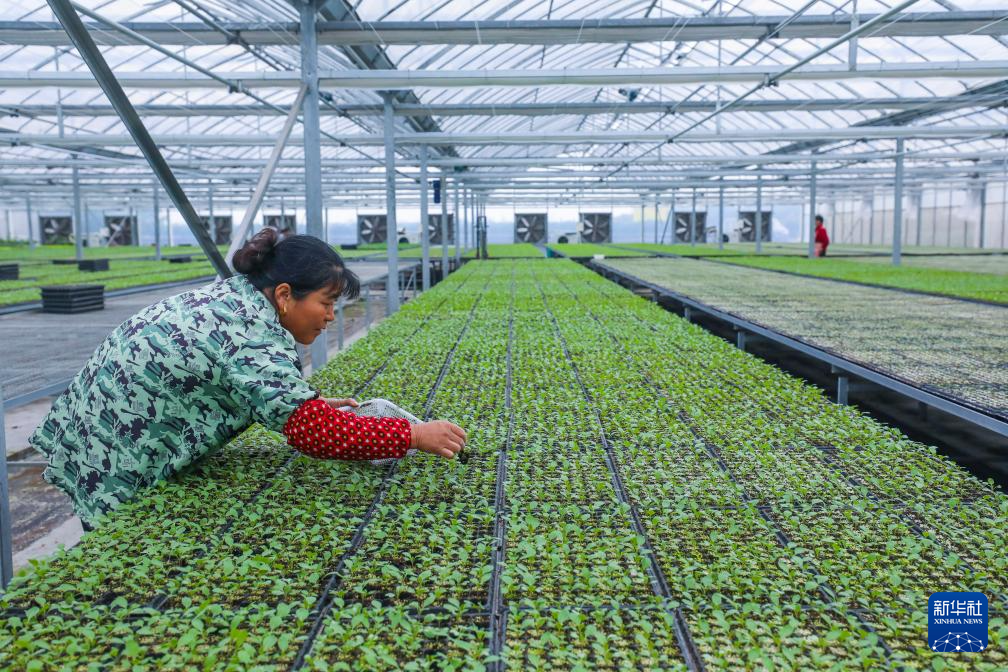 11月18日,在浙江省杭州市钱塘区的“勿忘农集团科研中心”的蔬菜大棚内,工作人员在养护适合“阳台菜园”种植的蔬菜种苗。