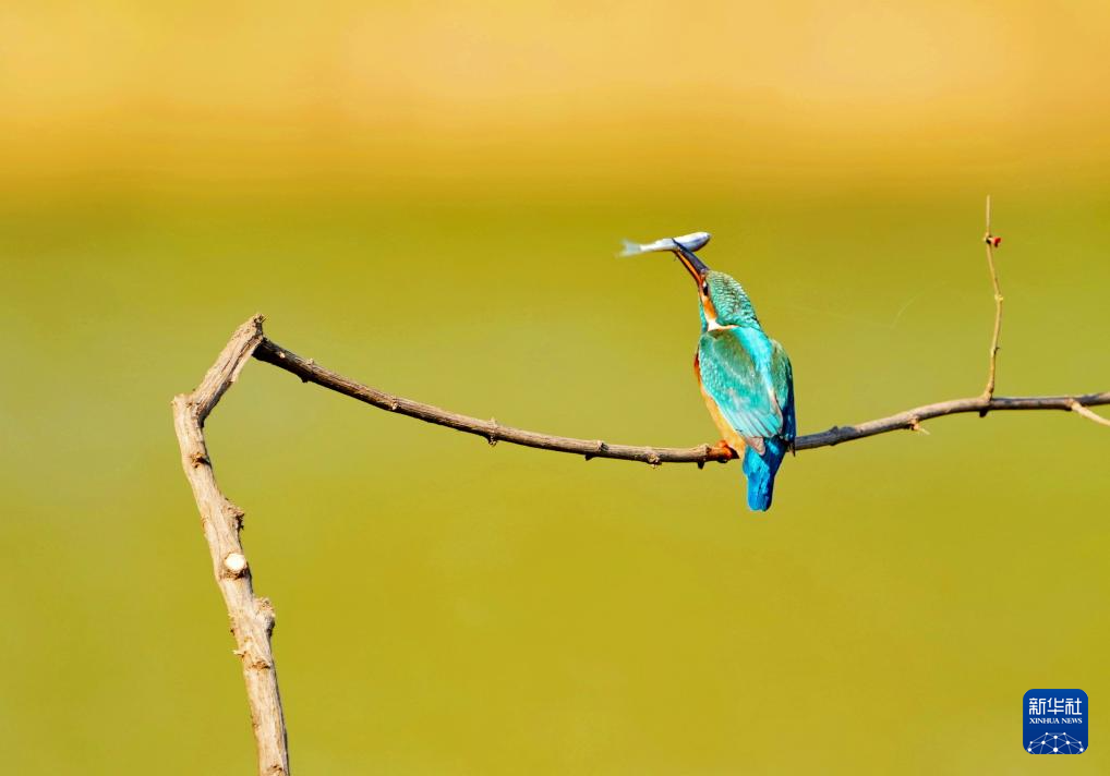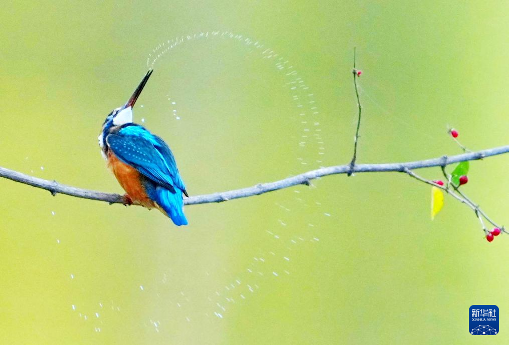 翠鸟在济南森林公园揽翠湖畔枝头上甩水(11月17日摄)。