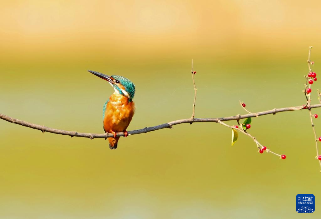 翠鸟在济南森林公园揽翠湖畔枝头观望(11月17日摄)。