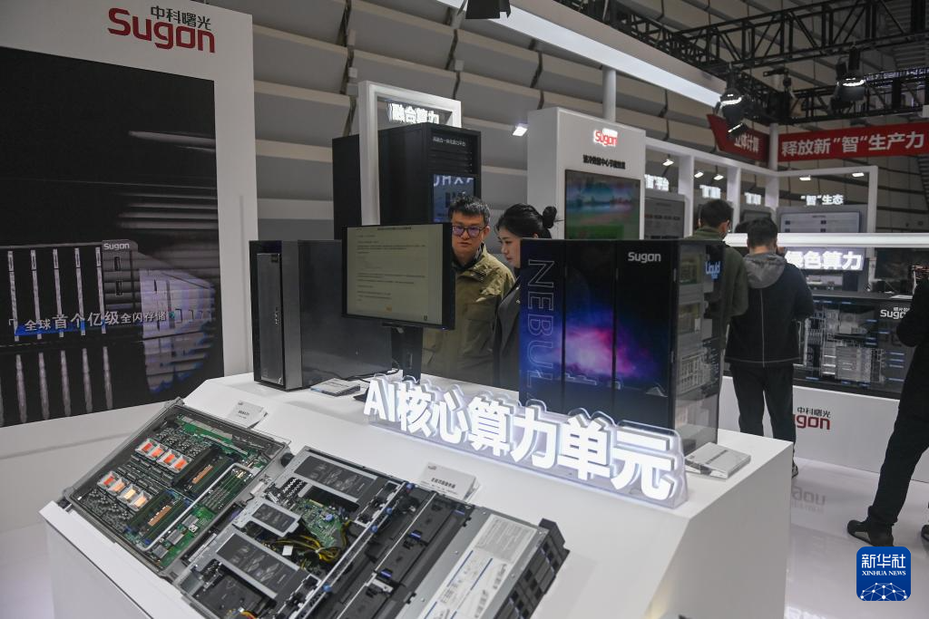 11月19日,在2024年世界互联网大会“互联网之光”博览会上,观众在中科曙光展台参观AI核心算力单元的设备。