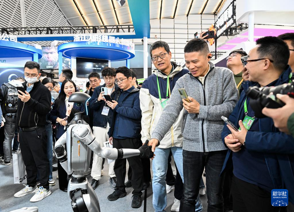 11月19日,在2024年世界互联网大会“互联网之光”博览会人形机器人专区,参观者与一款人形机器人握手。