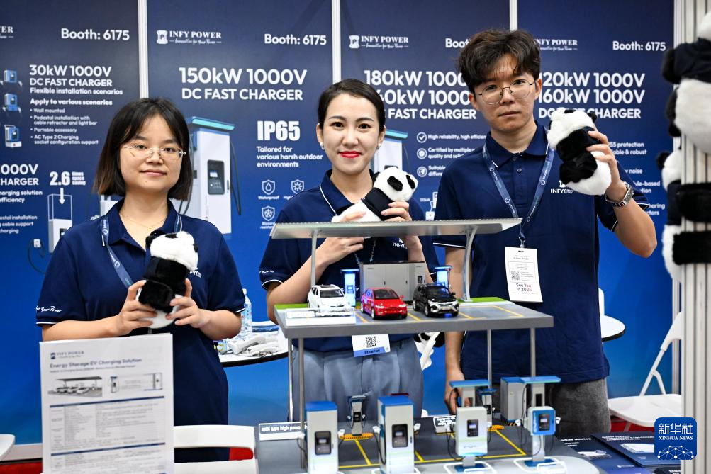 11月19日,在马来西亚吉隆坡,深圳英飞源技术有限公司亚太区销售总监迟源(中)在2024马来西亚智慧国家展的展位工作。