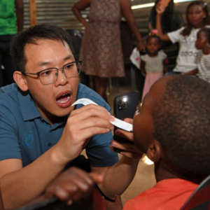 11月20日,在纳米比亚首都温得和克附近的弗兰斯艺术培训中心,中国医生给孩子们进行口腔健康检查。