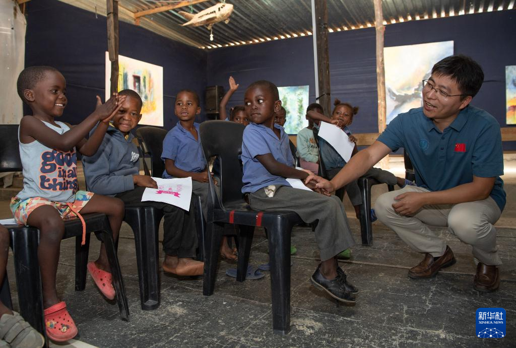 11月20日,在纳米比亚首都温得和克附近的弗兰斯艺术培训中心,中国医生与孩子们做游戏。