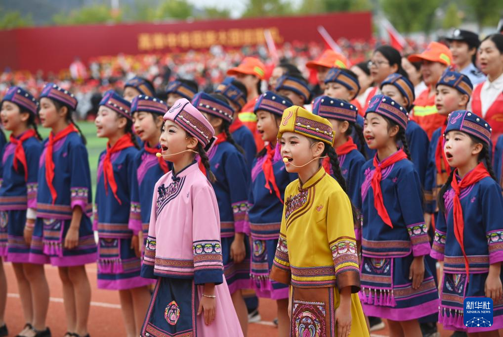 11月20日,在广西罗城仫佬族自治县体育中心,小朋友在自治县成立40周年群众文艺展演中唱歌。