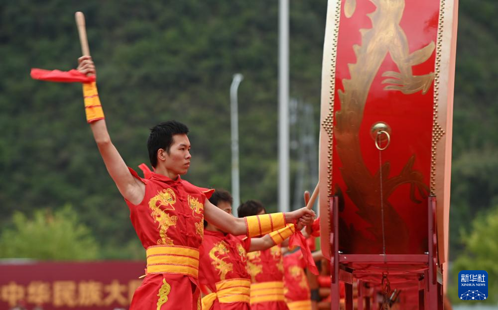 11月20日,在广西罗城仫佬族自治县体育中心,几名男子在自治县成立40周年群众文艺展演中擂鼓表演。