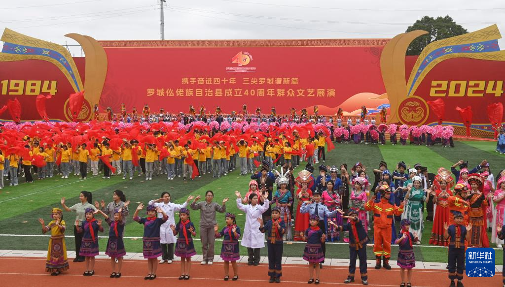 当日,广西罗城仫佬族自治县举行成立40周年庆祝大会,当地各族同胞欢聚一堂,载歌载舞,欢庆自治县成立40周年。