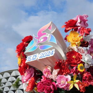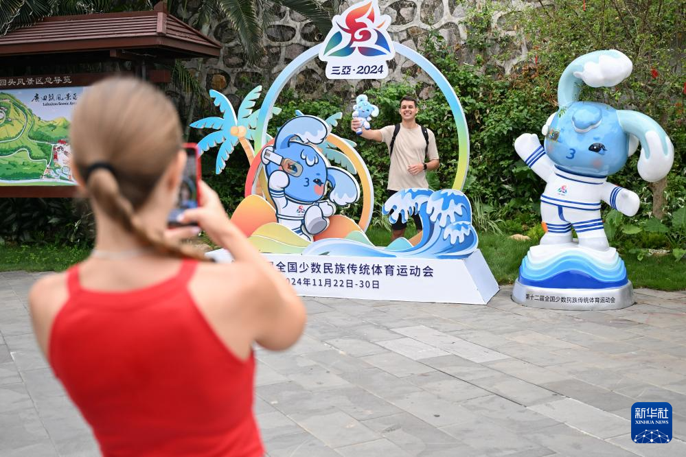 11月19日,游客在三亚鹿回头景区与运动会主题装饰合影。