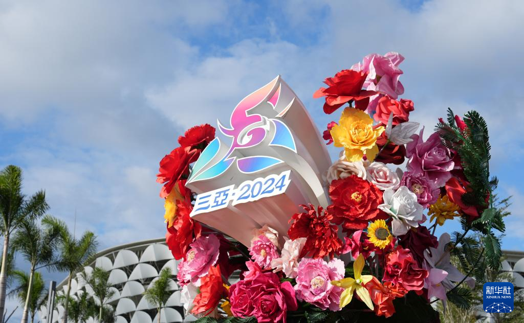 这是在三亚街头拍摄的运动会主题花坛(11月18日摄)。