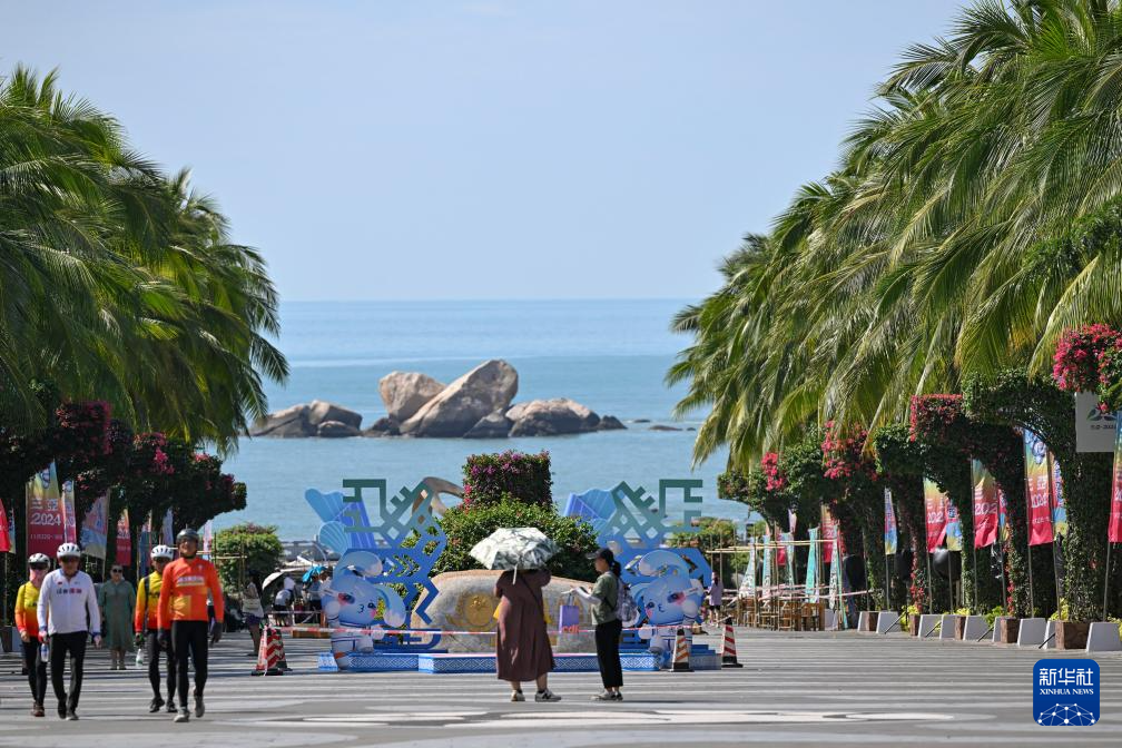 11月19日,游客从三亚天涯海角游览区运动会吉祥物前经过。