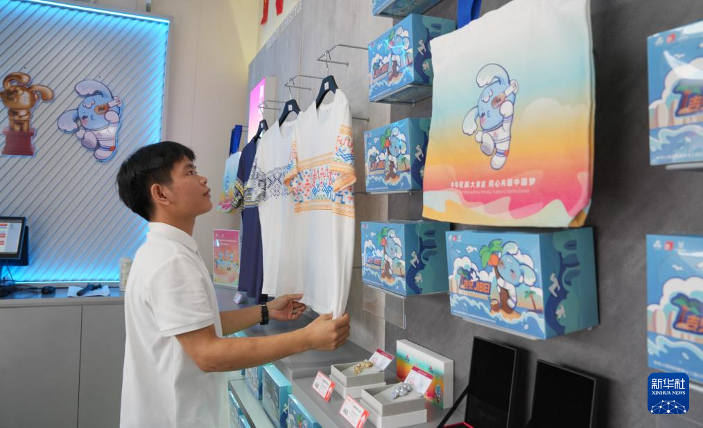 11月19日,工作人员在三亚鹿回头景区运动会特许商品店整理商品。