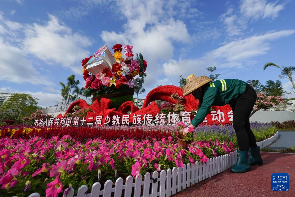 11月18日,工作人员在三亚街头的运动会主题花坛整理花卉。