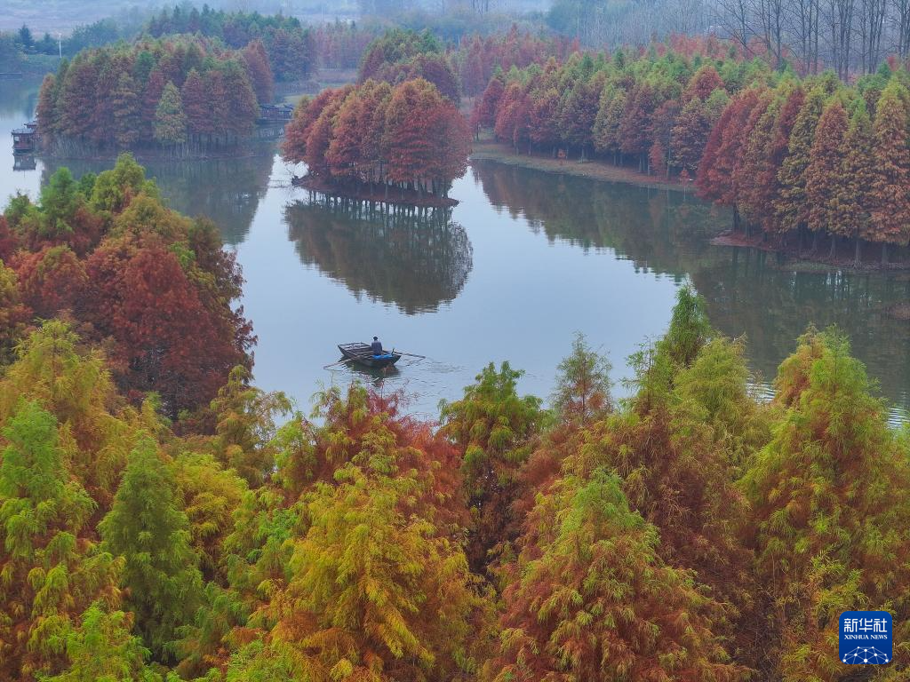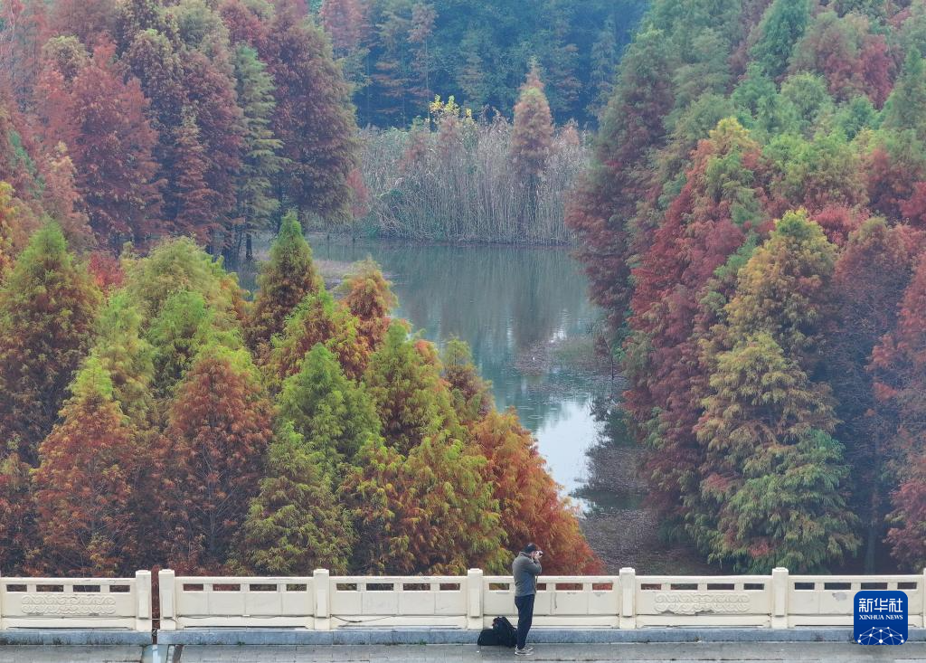 初冬时节,江苏省淮安市盱眙县铁山寺国家森林公园色彩斑斓,天泉湖碧水与彩林相映成趣,美不胜收。