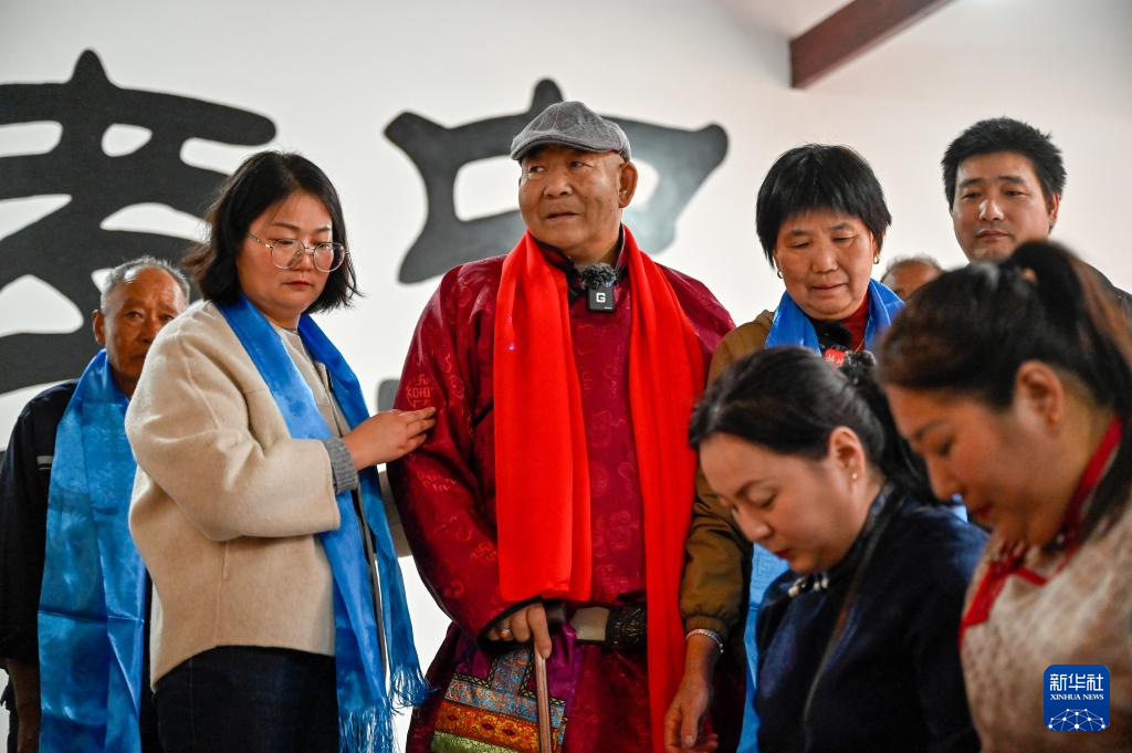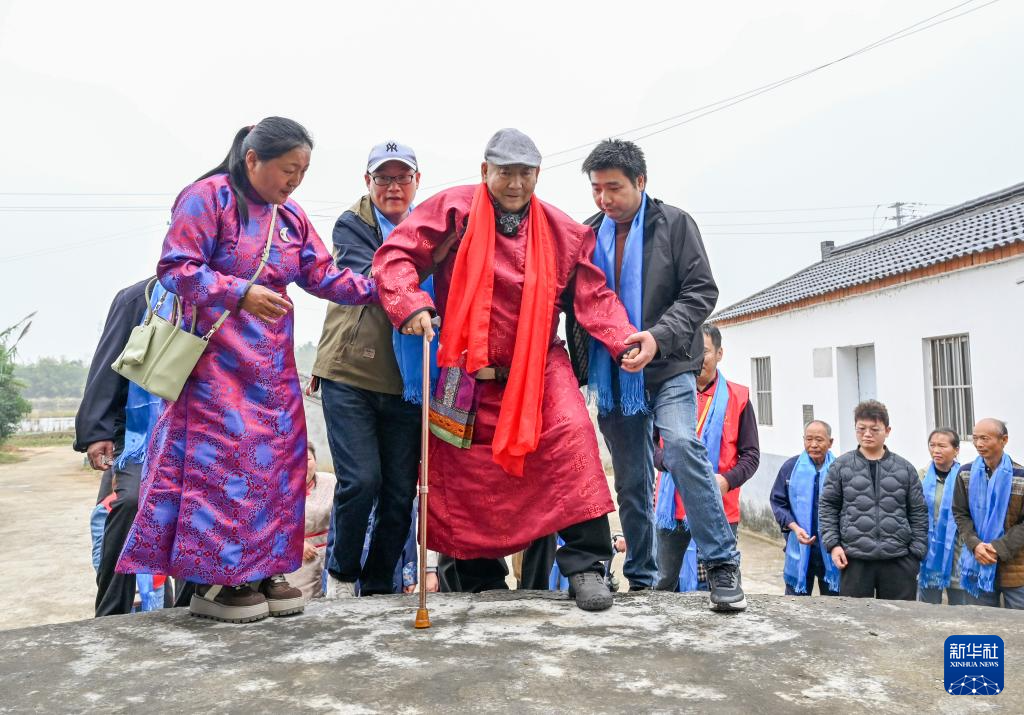 11月16日,扎拉嘎木吉在众人搀扶下走向家族宗祠。新华社记者 贺书琛 摄pagebreak