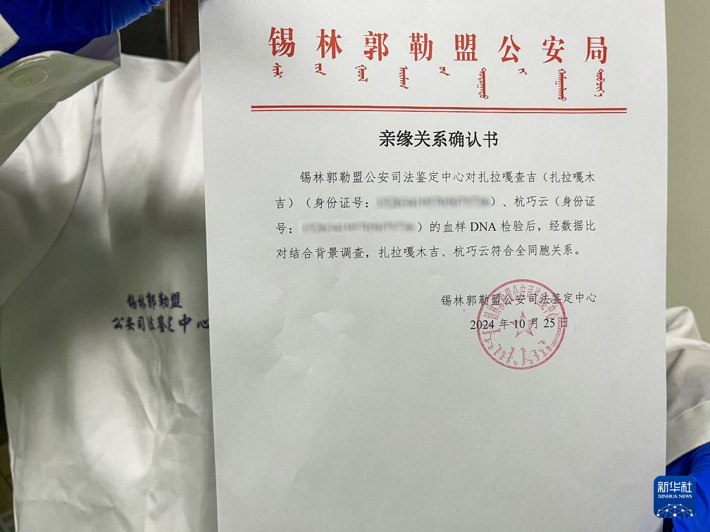 11月20日,锡林郭勒盟公安局司法鉴定中心工作人员展示扎拉嘎木吉和江苏亲人的亲缘关系确认书。新华社记者 刘懿德 摄pagebreak