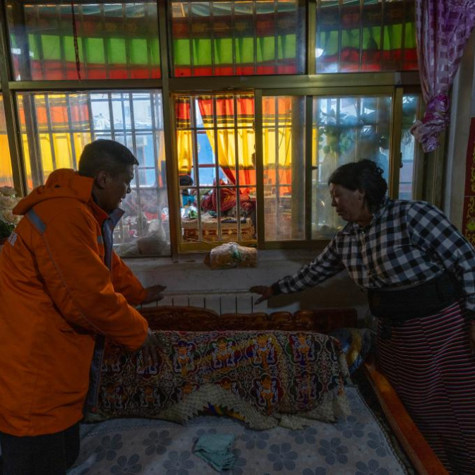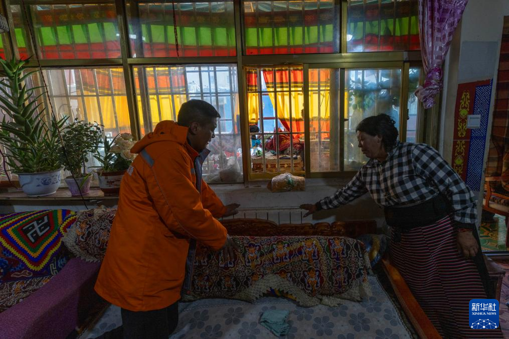措勤县城区清洁能源集中供暖特许经营项目工作人员次旺罗布(左)在扎日南木错社区居民曲珍家查看供暖情况(11月20日摄)。