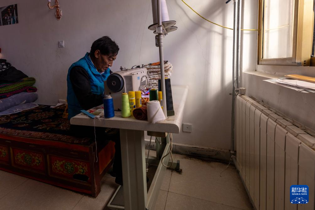 措勤县扎日南木错社区居民林琼在自家的暖气房内制作传统民族帽饰(11月20日摄)。