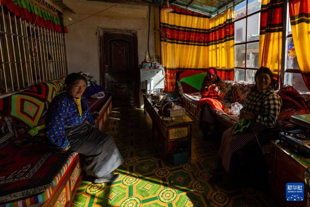 措勤县扎日南木错社区居民曲珍(右)在温暖的家中与姐妹一起做手工(11月20日摄)。