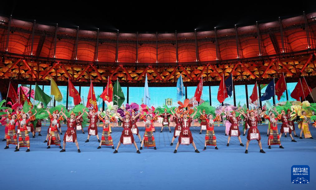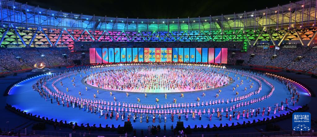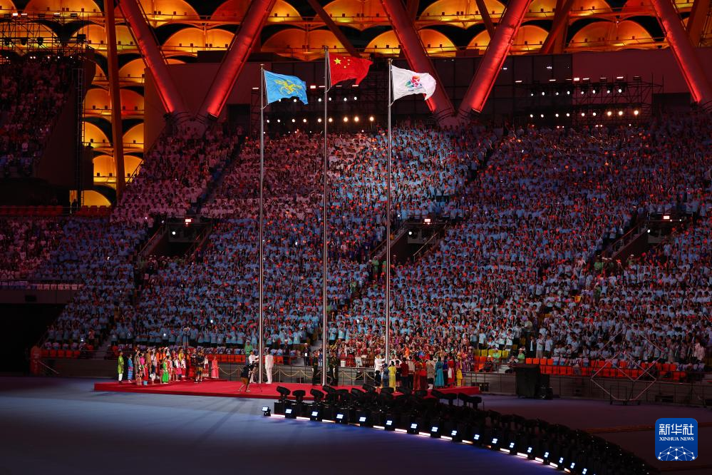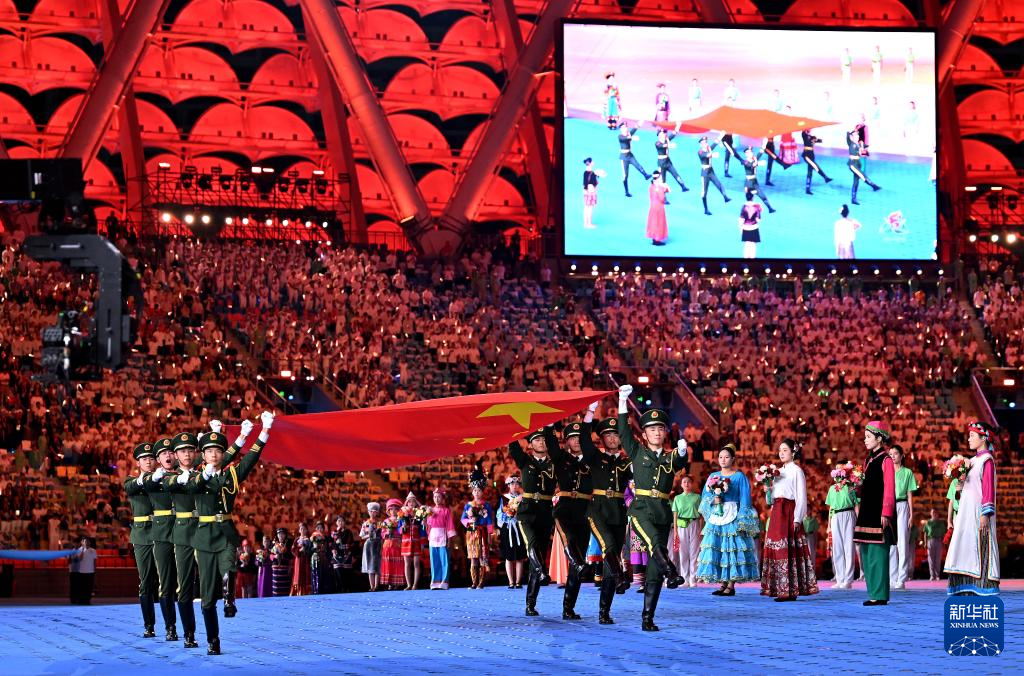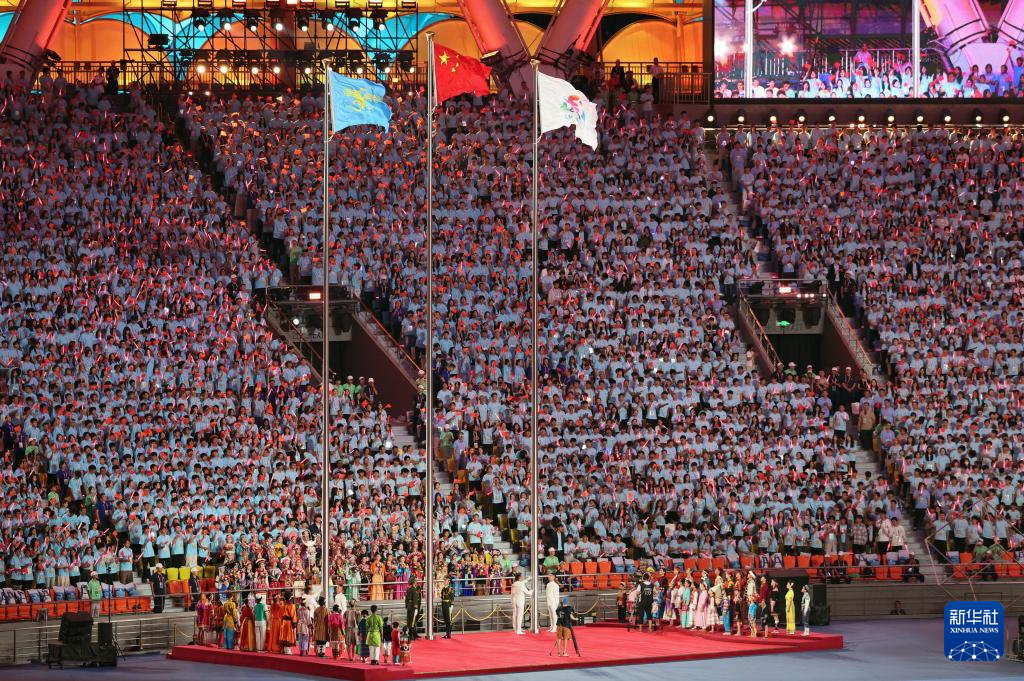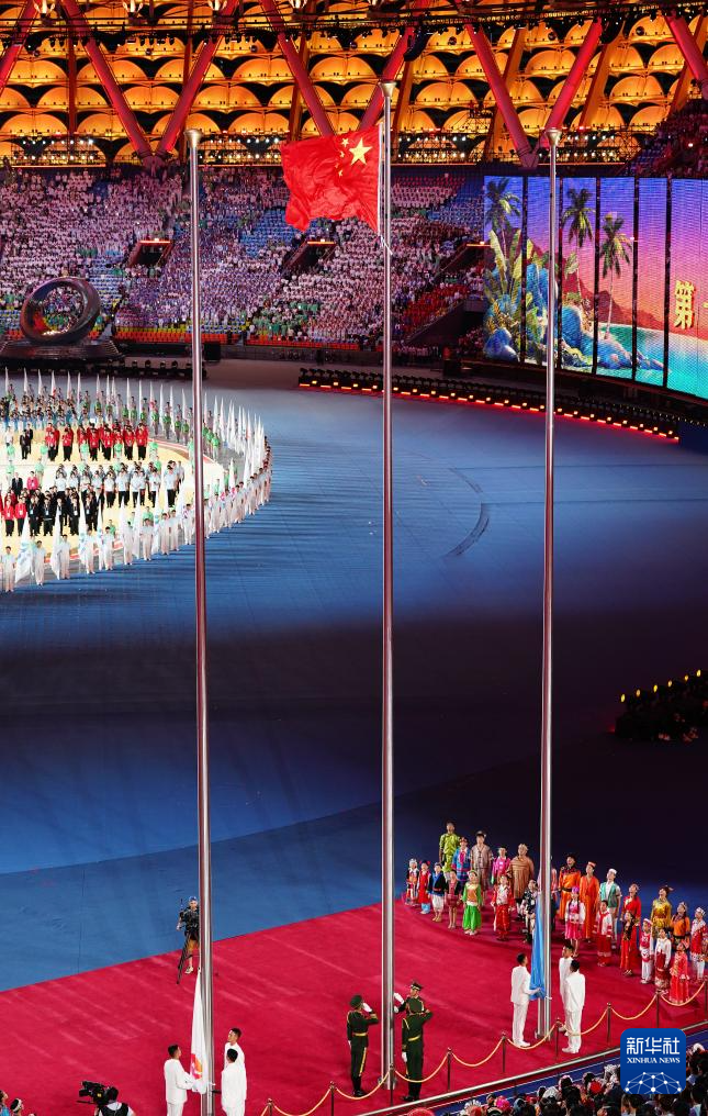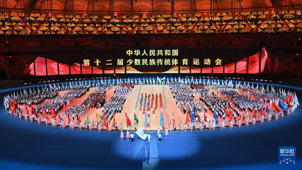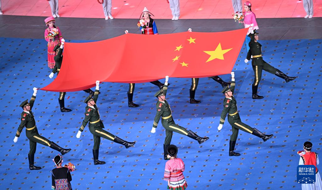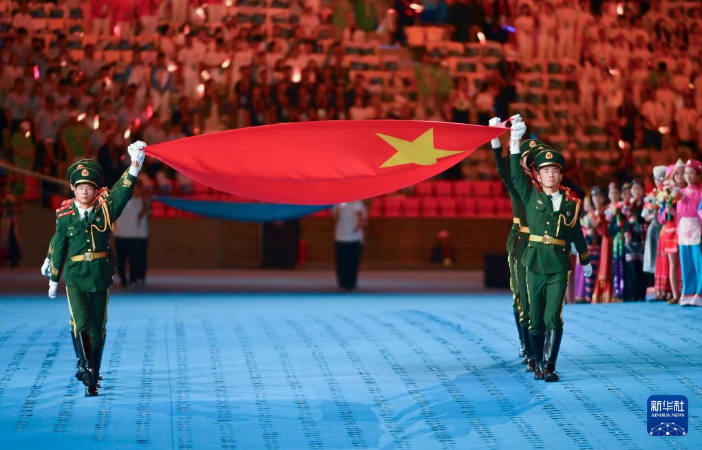 11月22日,开幕式现场升起中华人民共和国国旗、中华人民共和国少数民族传统体育运动会会旗和中华人民共和国第十二届少数民族传统体育运动会会旗。