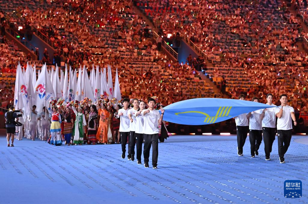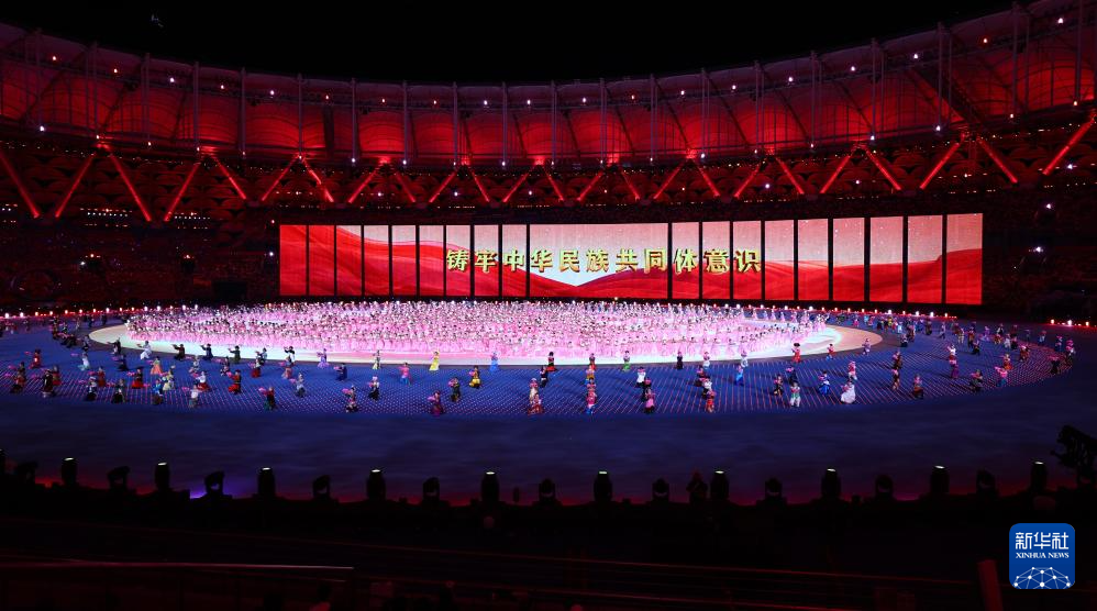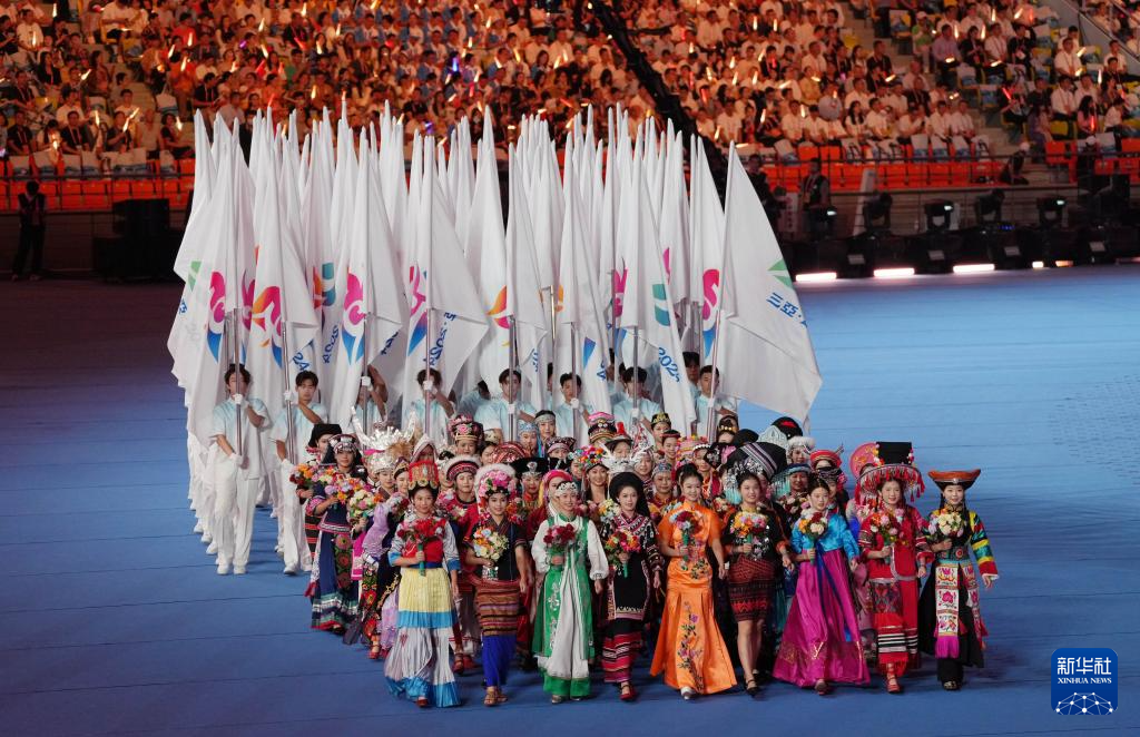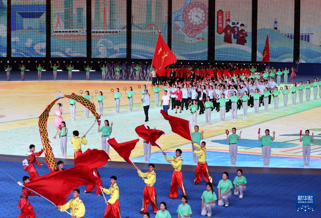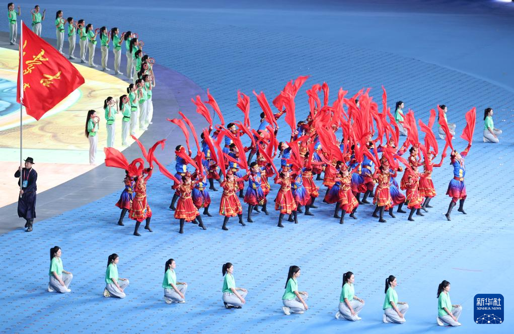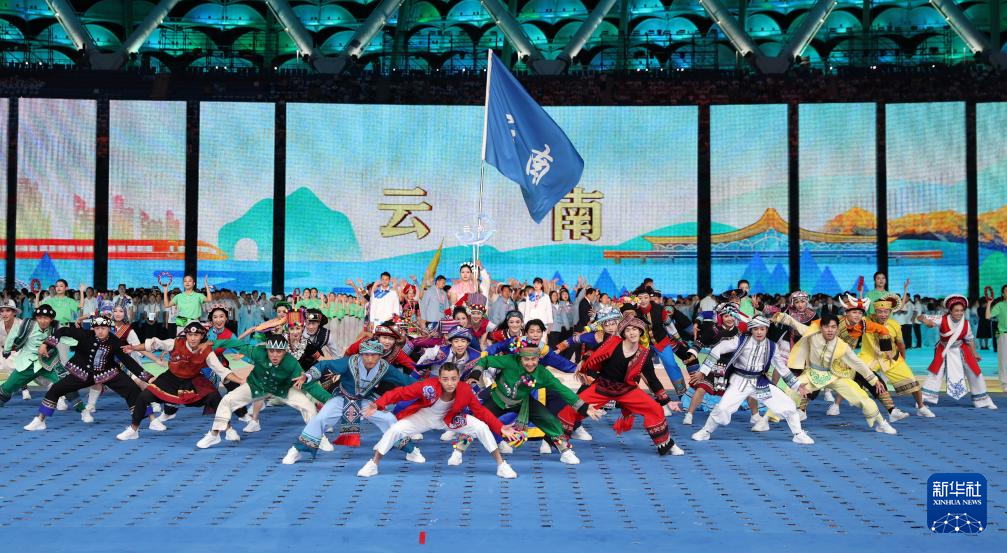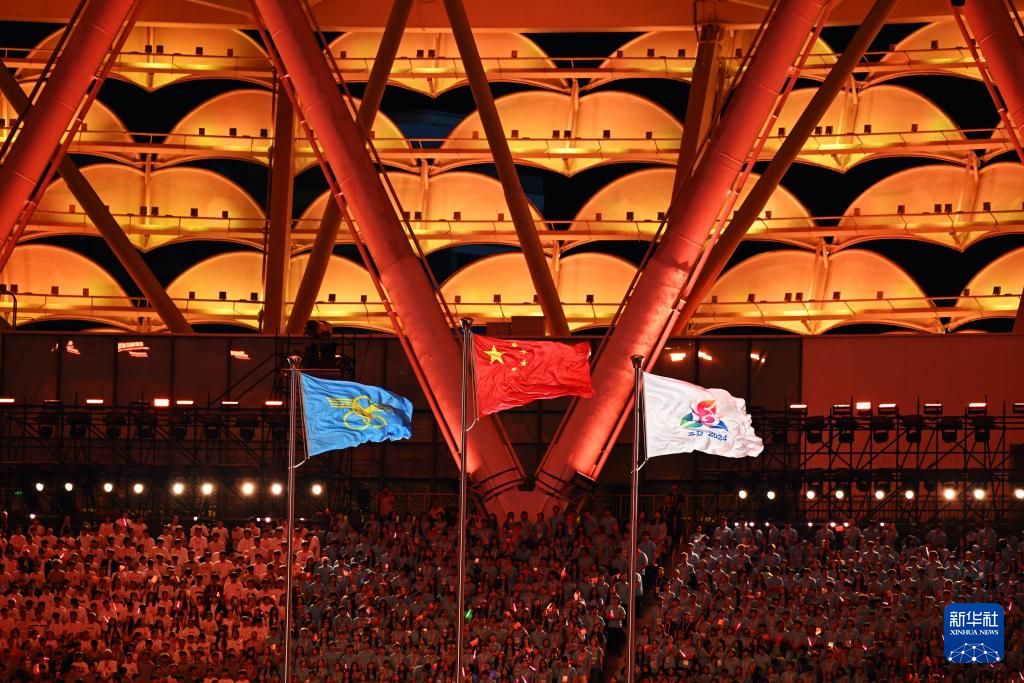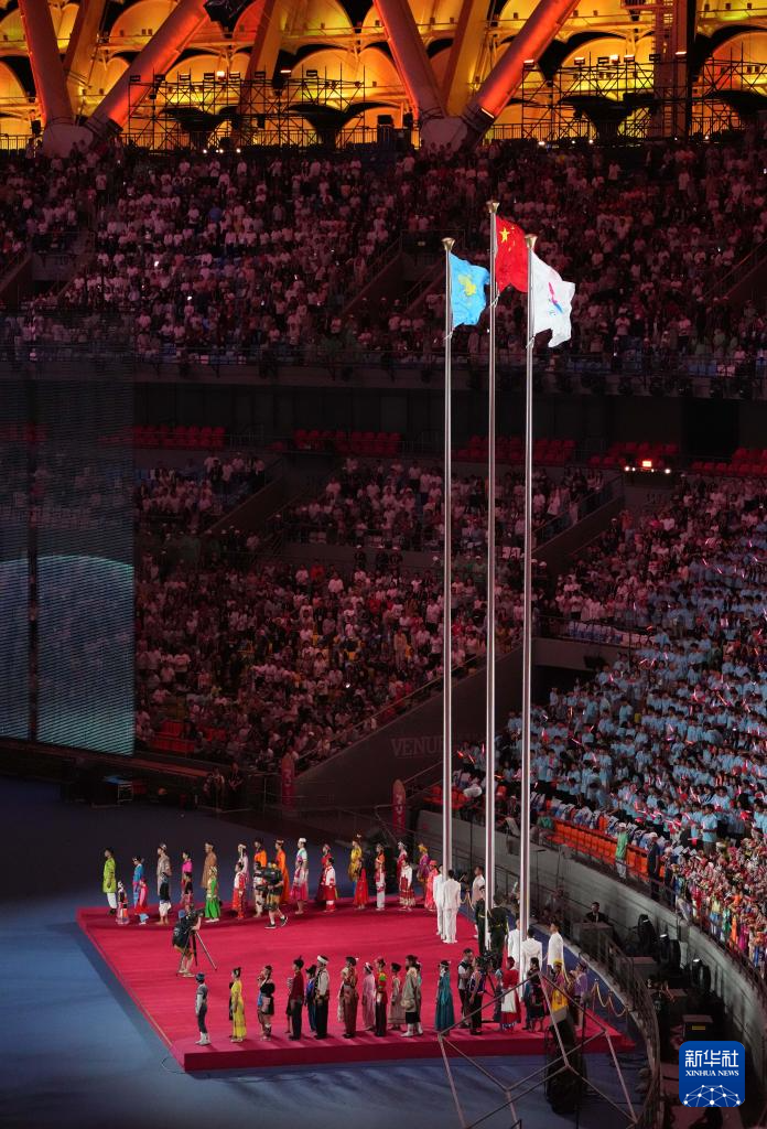 11月22日,开幕式现场升起中华人民共和国国旗、中华人民共和国少数民族传统体育运动会会旗和中华人民共和国第十二届少数民族传统体育运动会会旗。