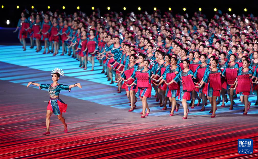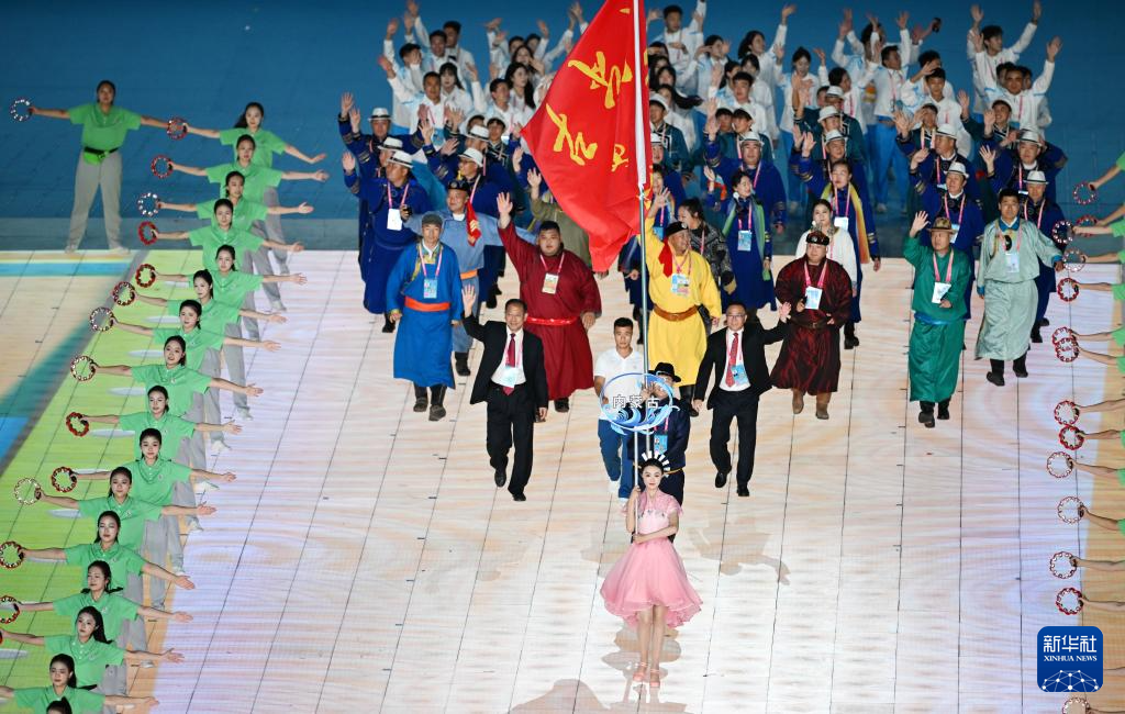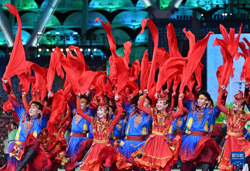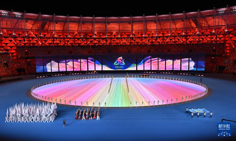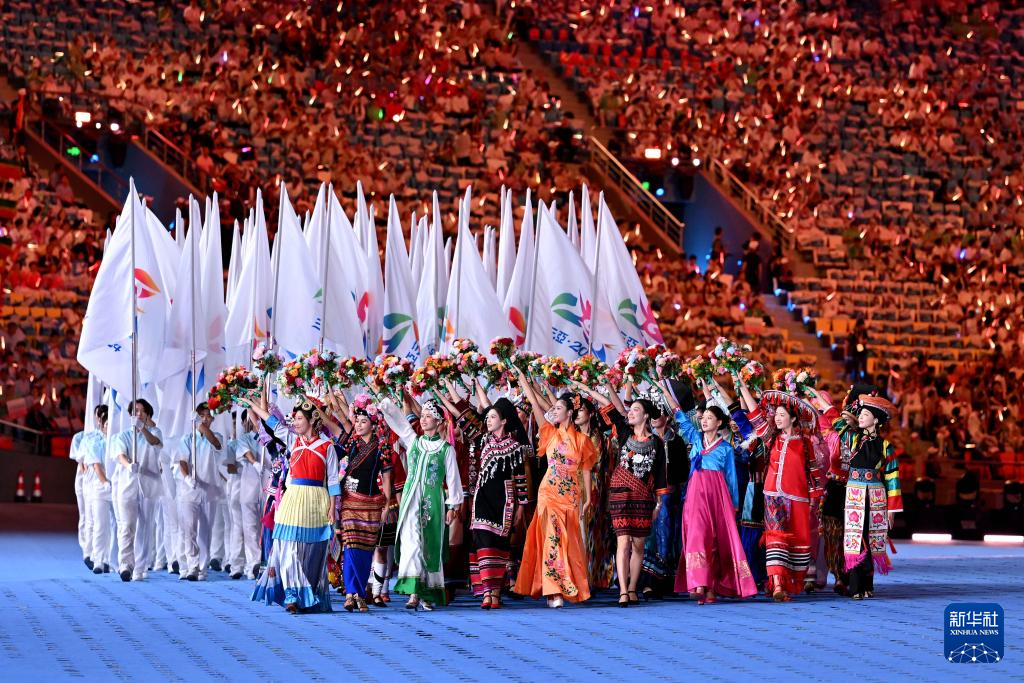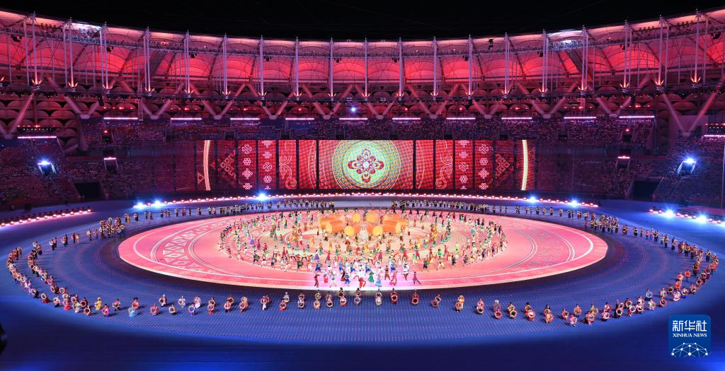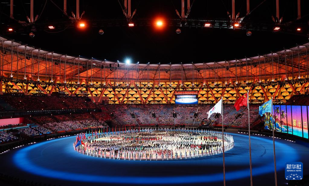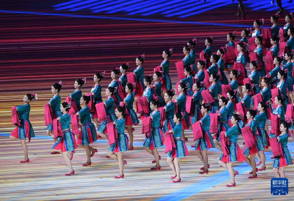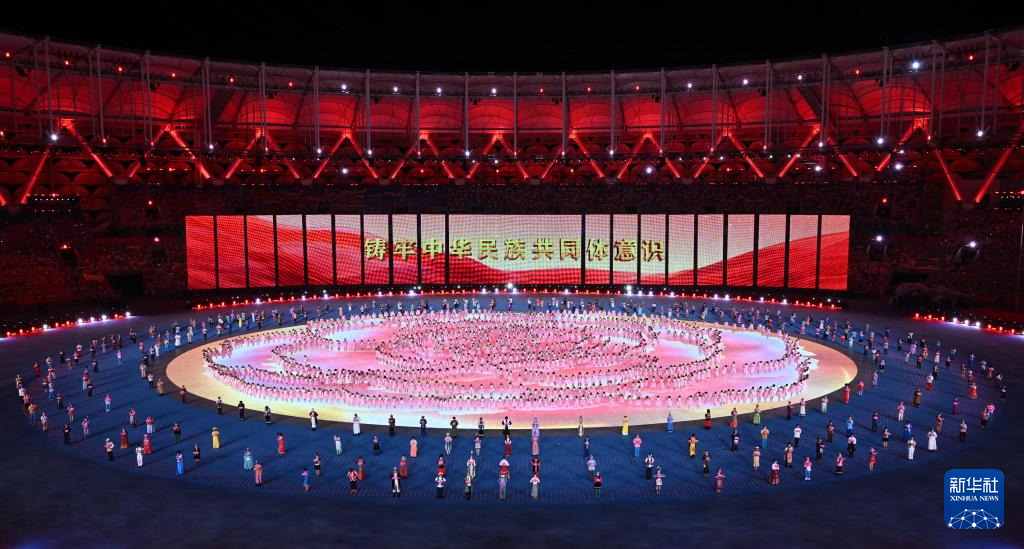 11月22日,开幕式现场升起中华人民共和国国旗、中华人民共和国少数民族传统体育运动会会旗和中华人民共和国第十二届少数民族传统体育运动会会旗。
