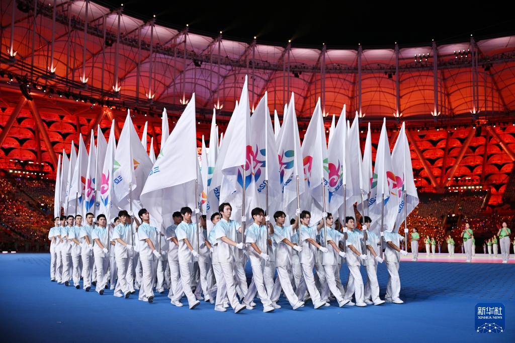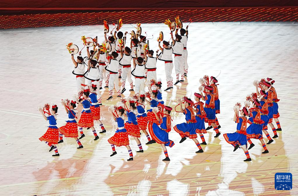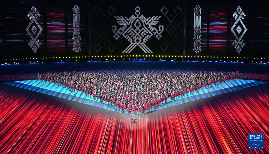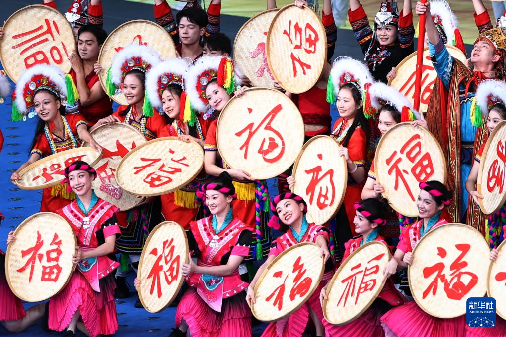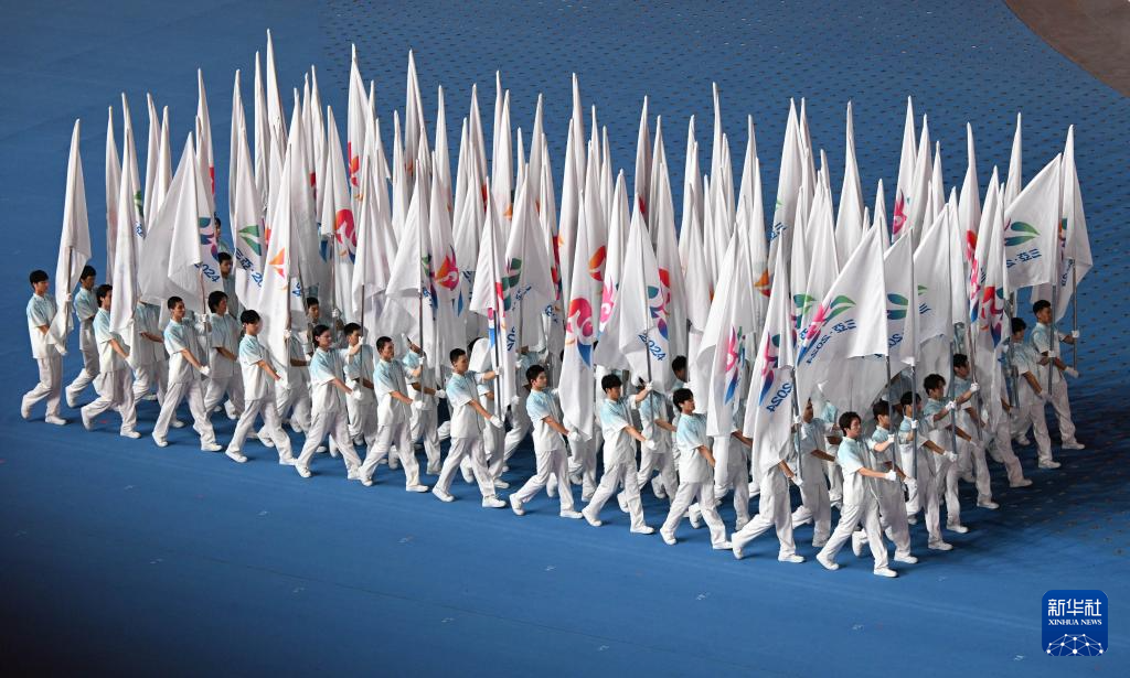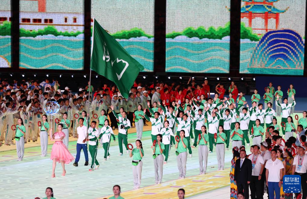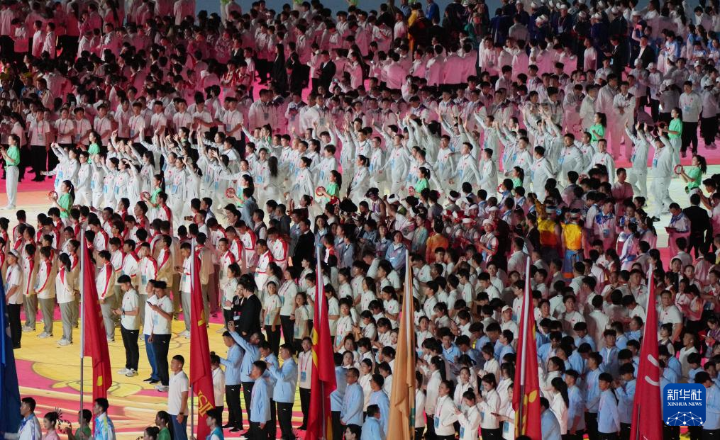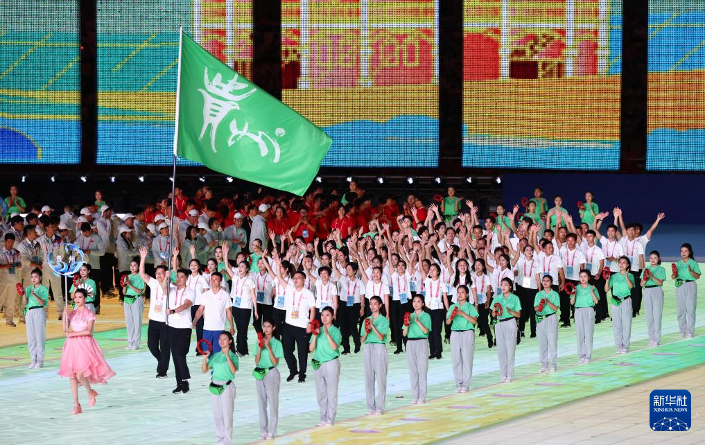 11月22日,开幕式现场升起中华人民共和国国旗、中华人民共和国少数民族传统体育运动会会旗和中华人民共和国第十二届少数民族传统体育运动会会旗。