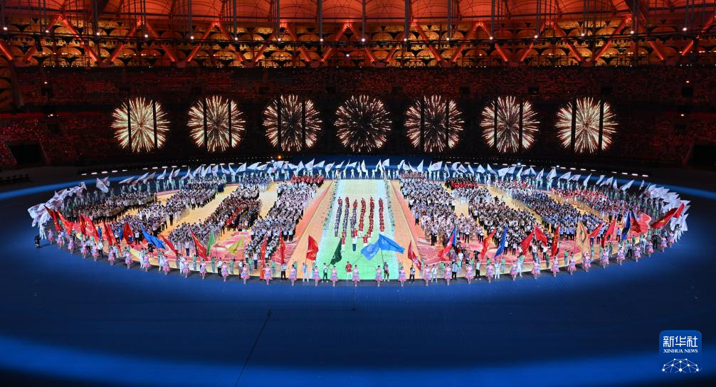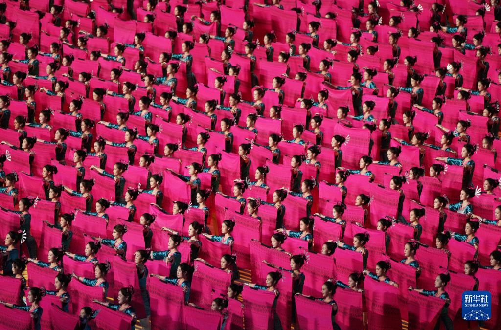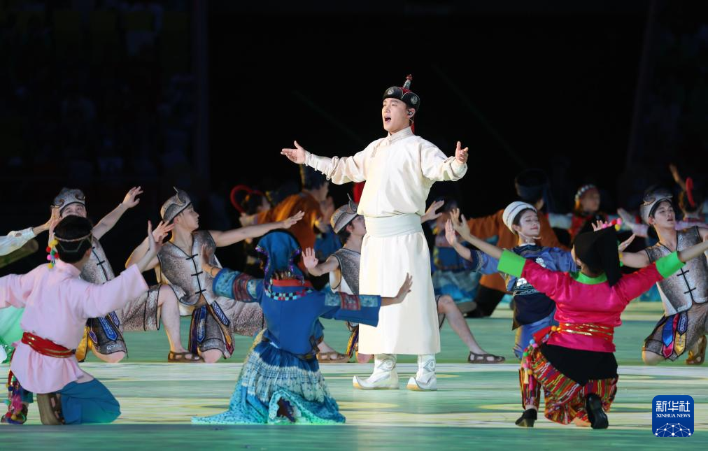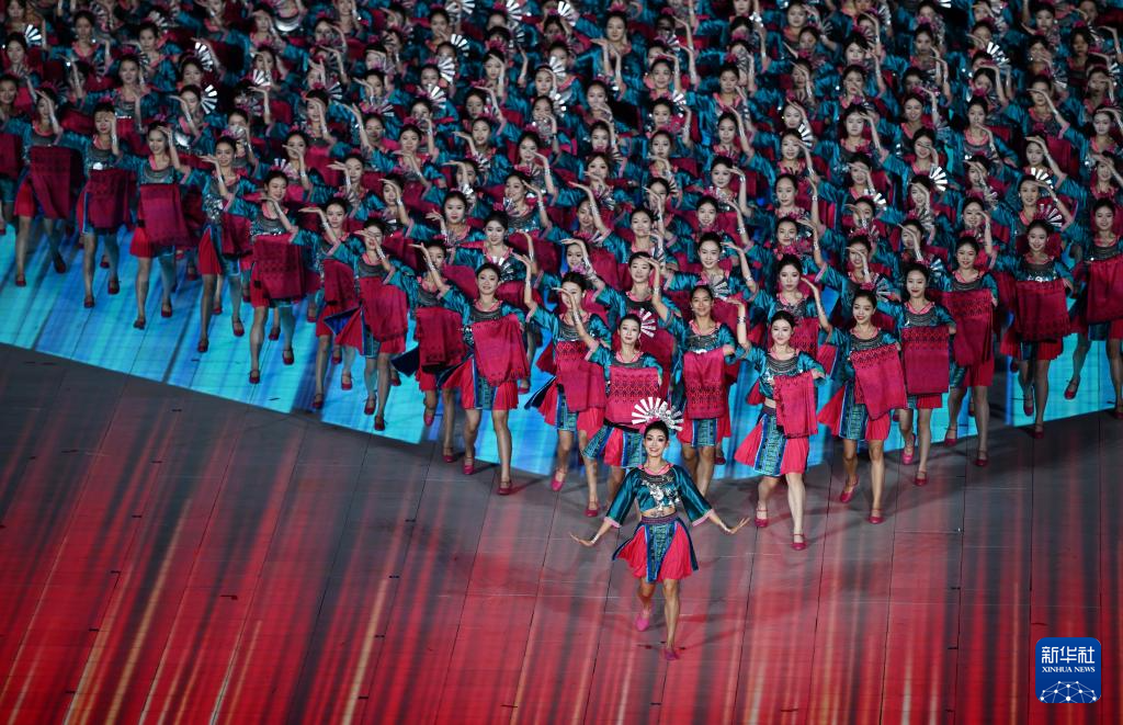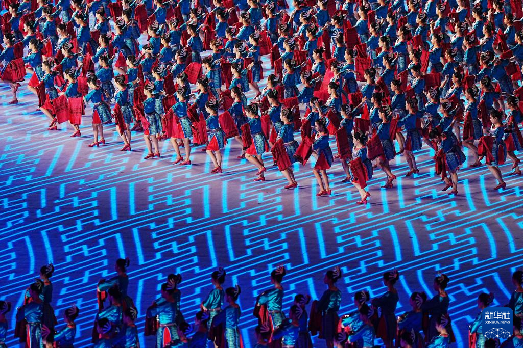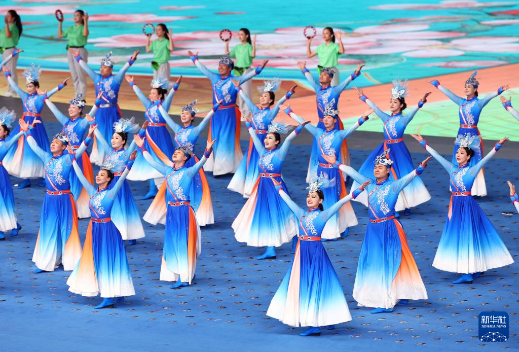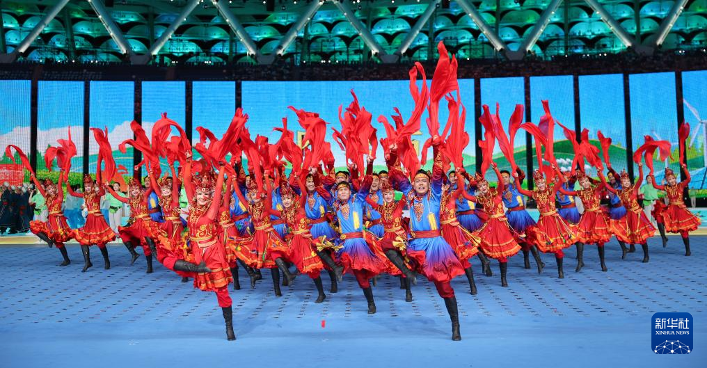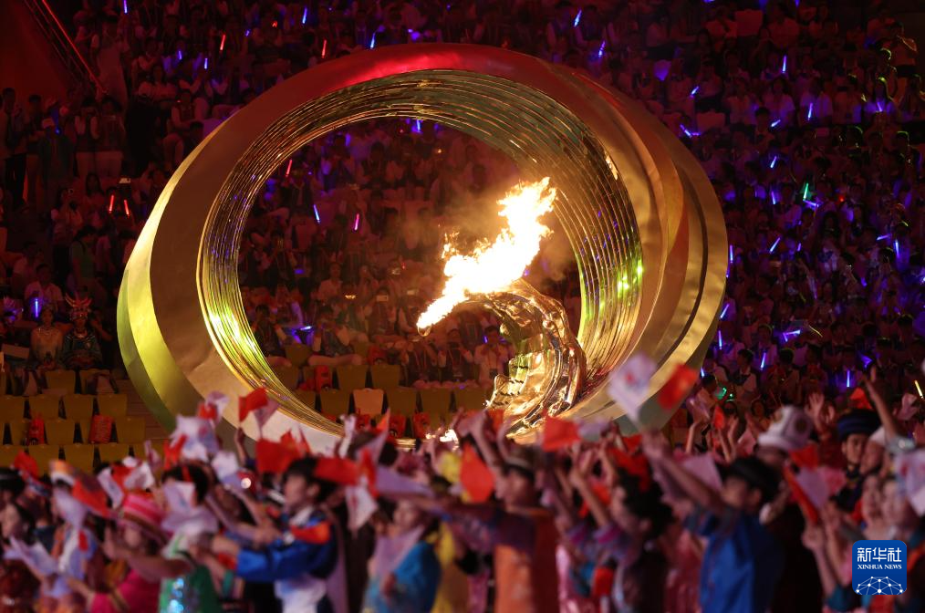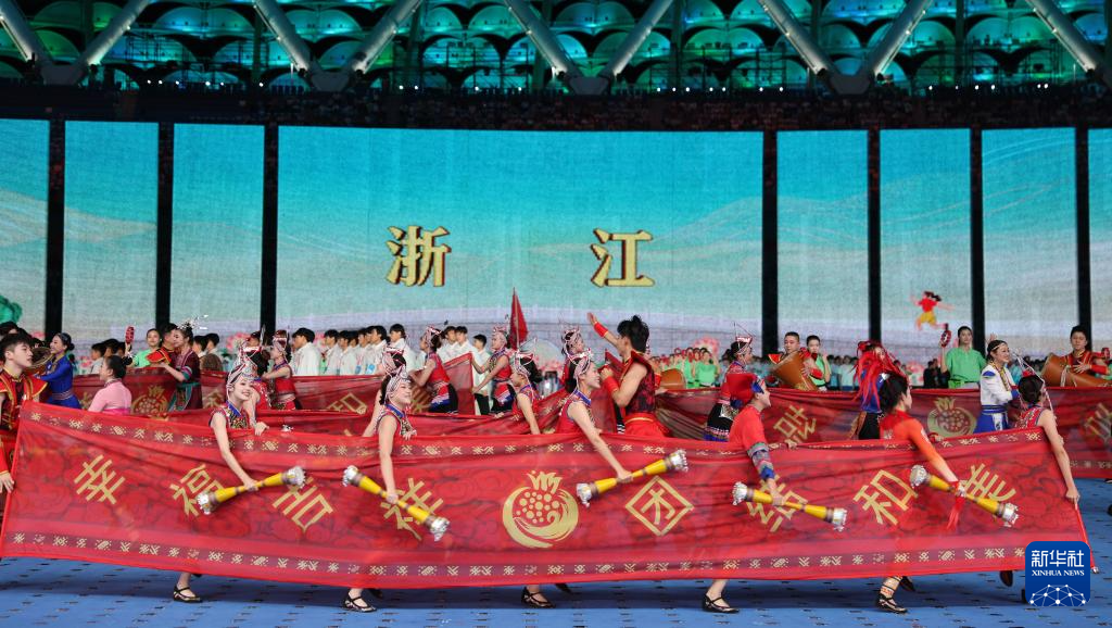 11月22日,开幕式现场升起中华人民共和国国旗、中华人民共和国少数民族传统体育运动会会旗和中华人民共和国第十二届少数民族传统体育运动会会旗。