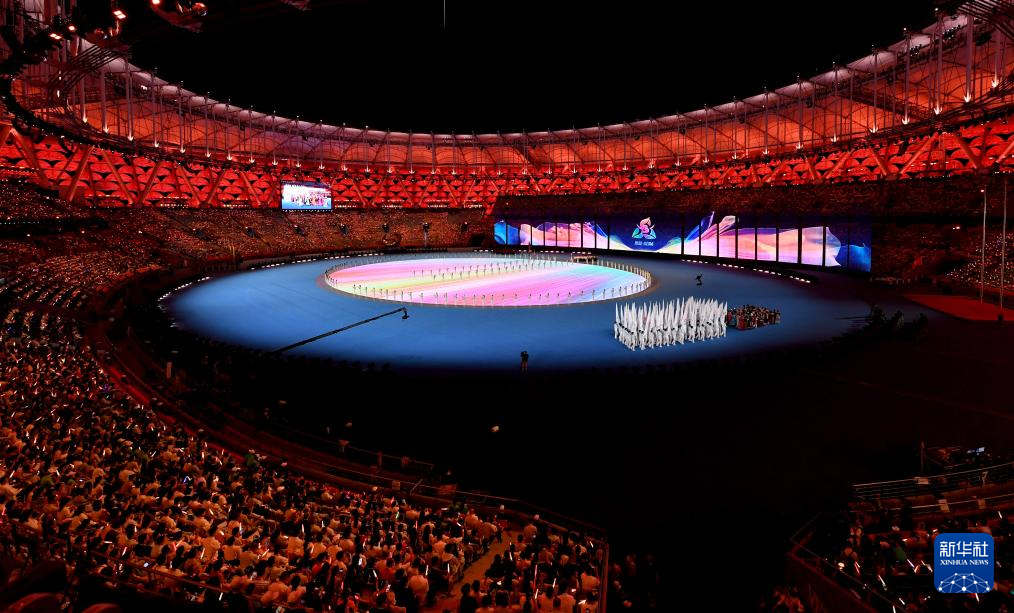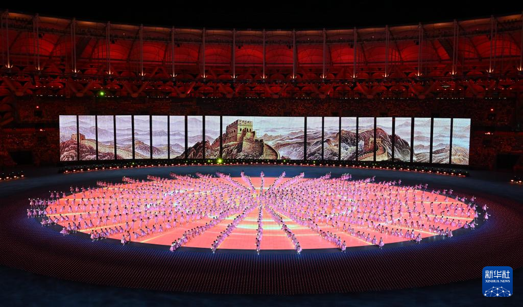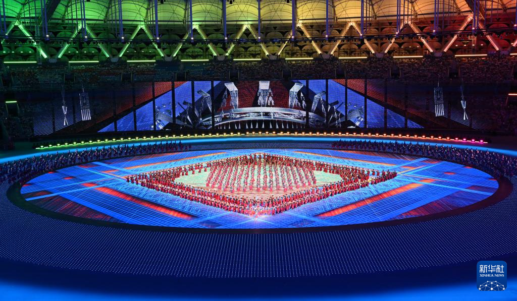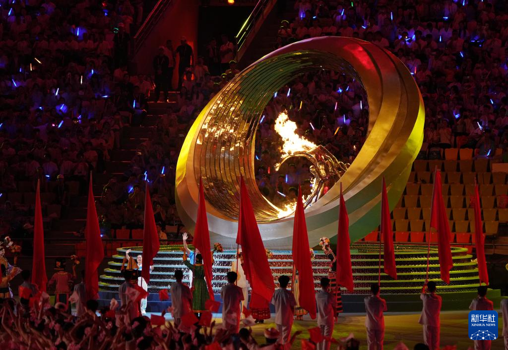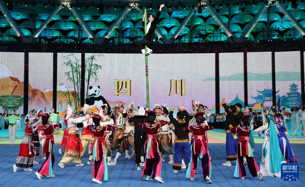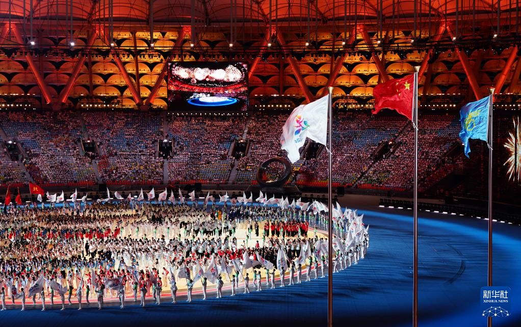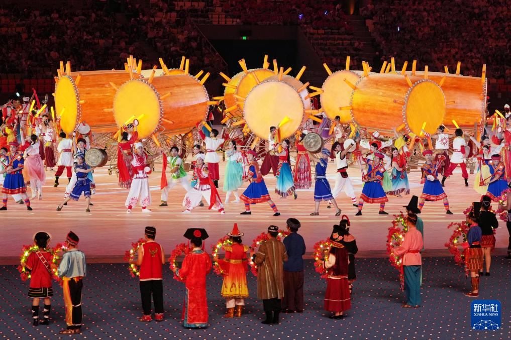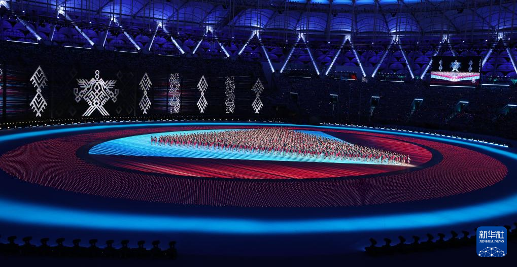 11月22日,开幕式现场升起中华人民共和国国旗、中华人民共和国少数民族传统体育运动会会旗和中华人民共和国第十二届少数民族传统体育运动会会旗。