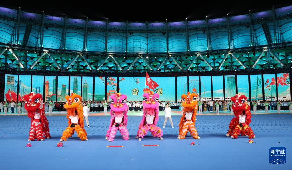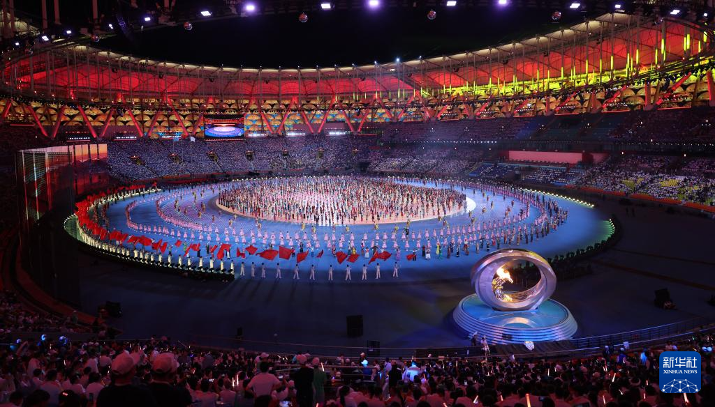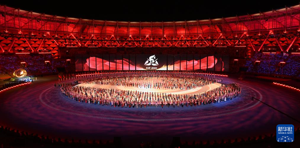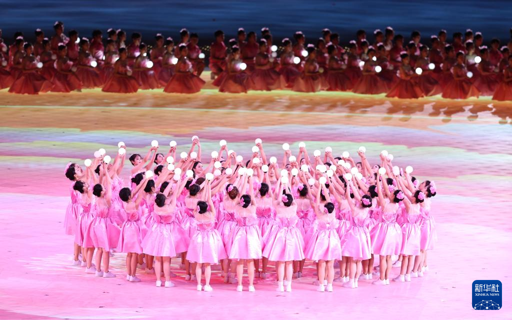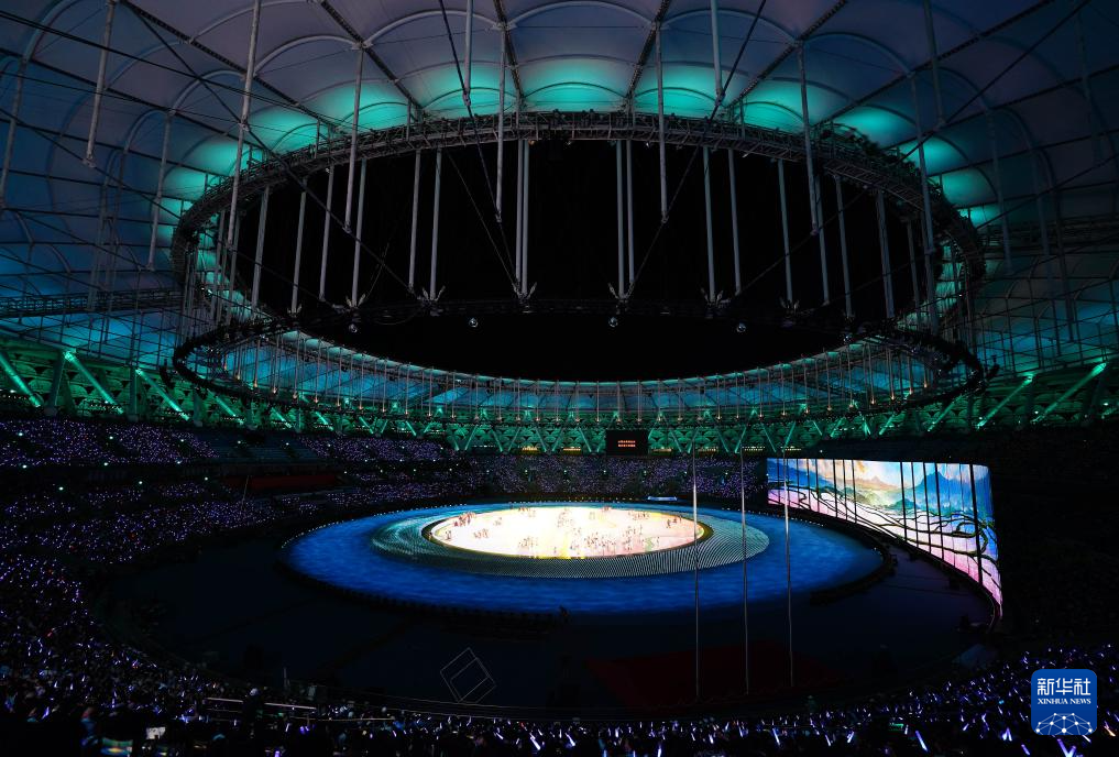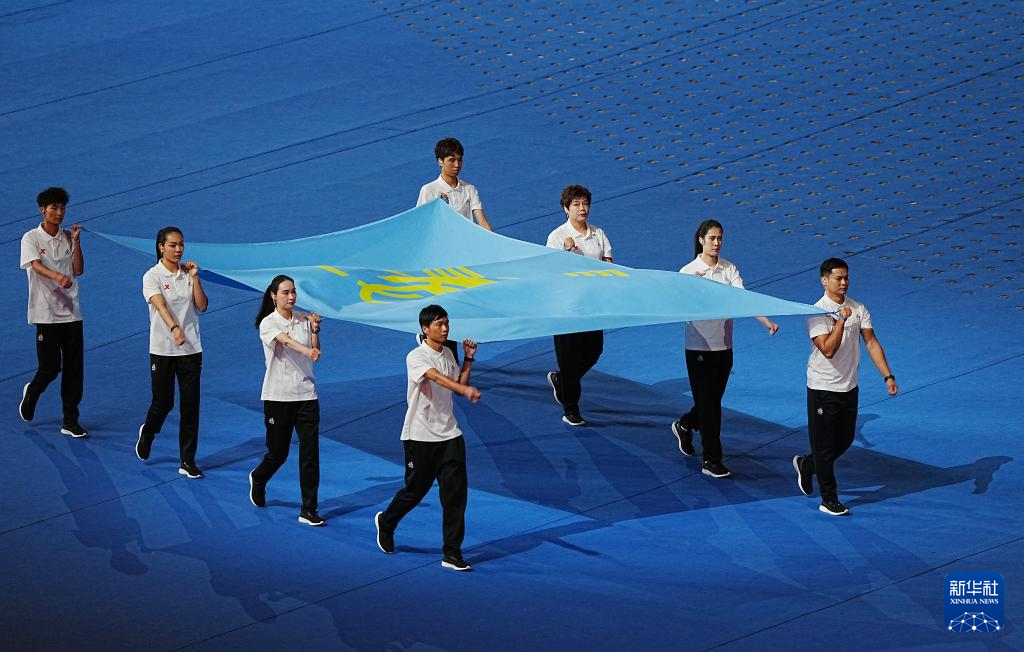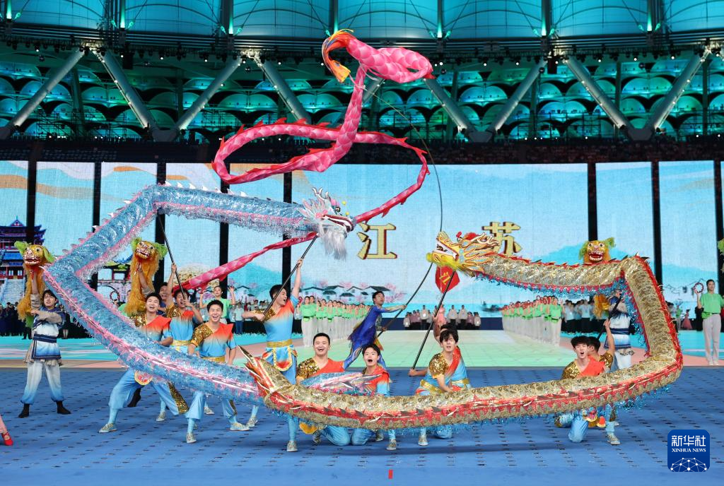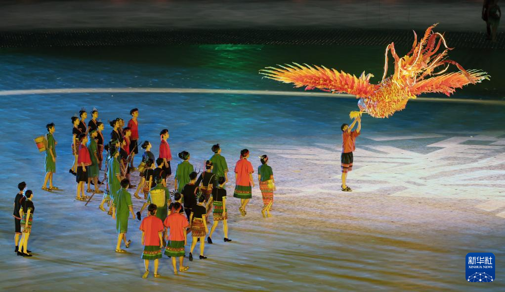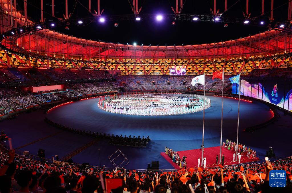11月22日,开幕式现场升起中华人民共和国国旗、中华人民共和国少数民族传统体育运动会会旗和中华人民共和国第十二届少数民族传统体育运动会会旗。
