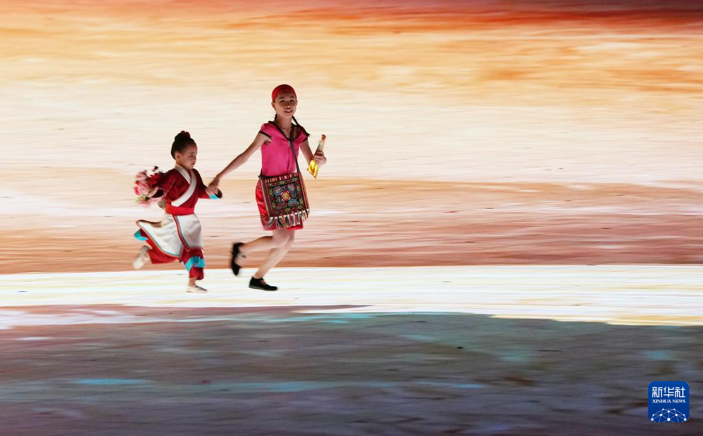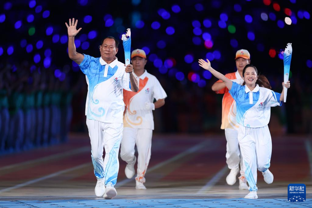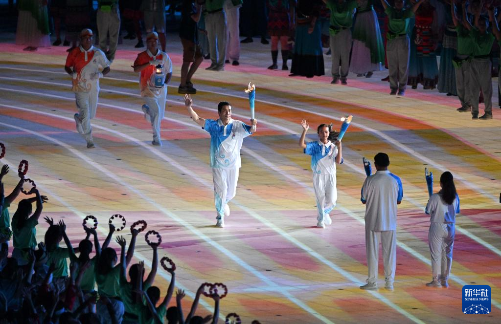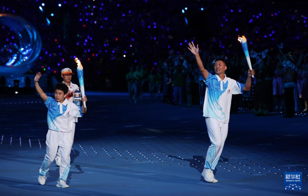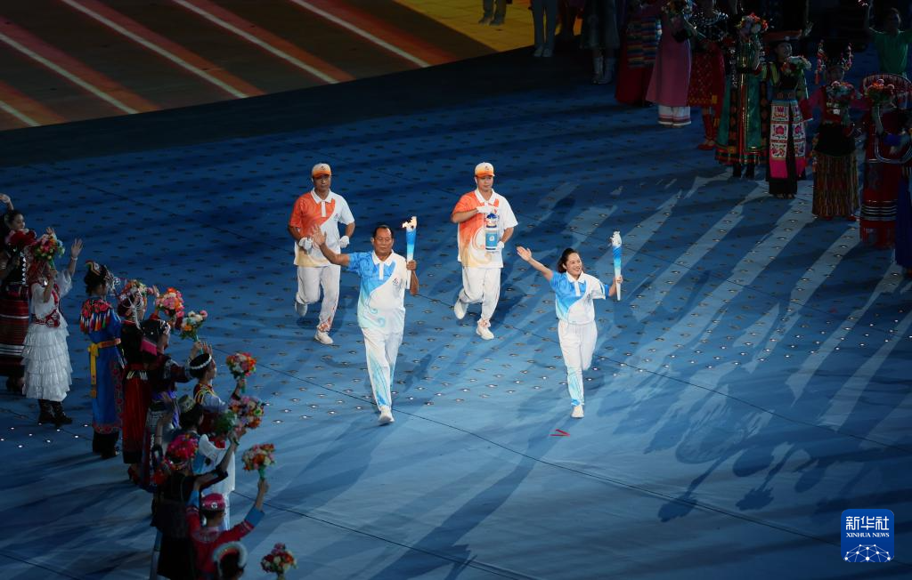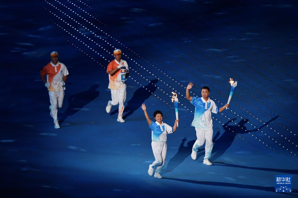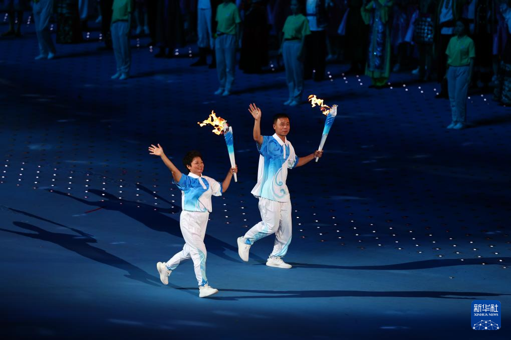 11月22日,火炬手符攀婵(右前)、王书茂(左前)共同在开幕式上传递火炬。