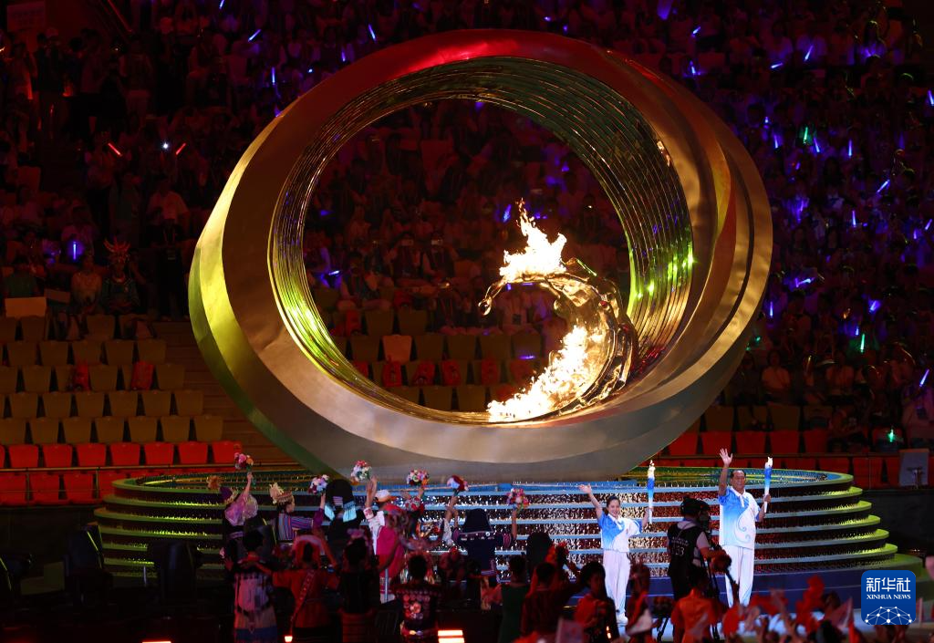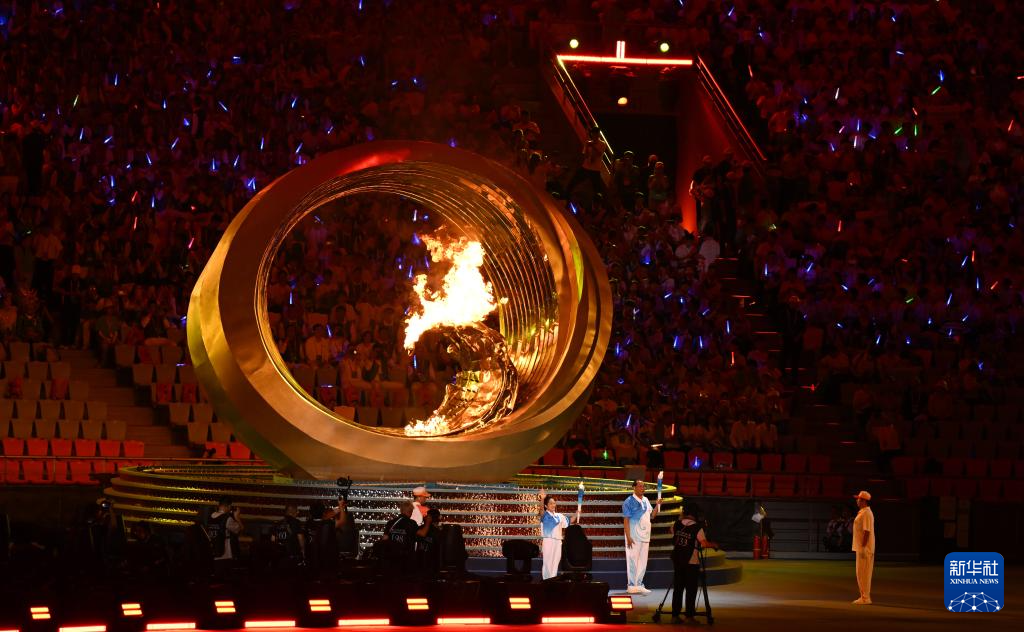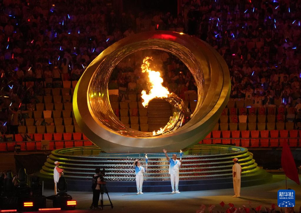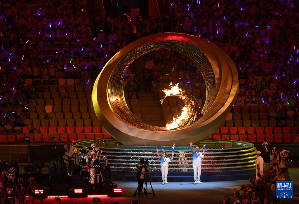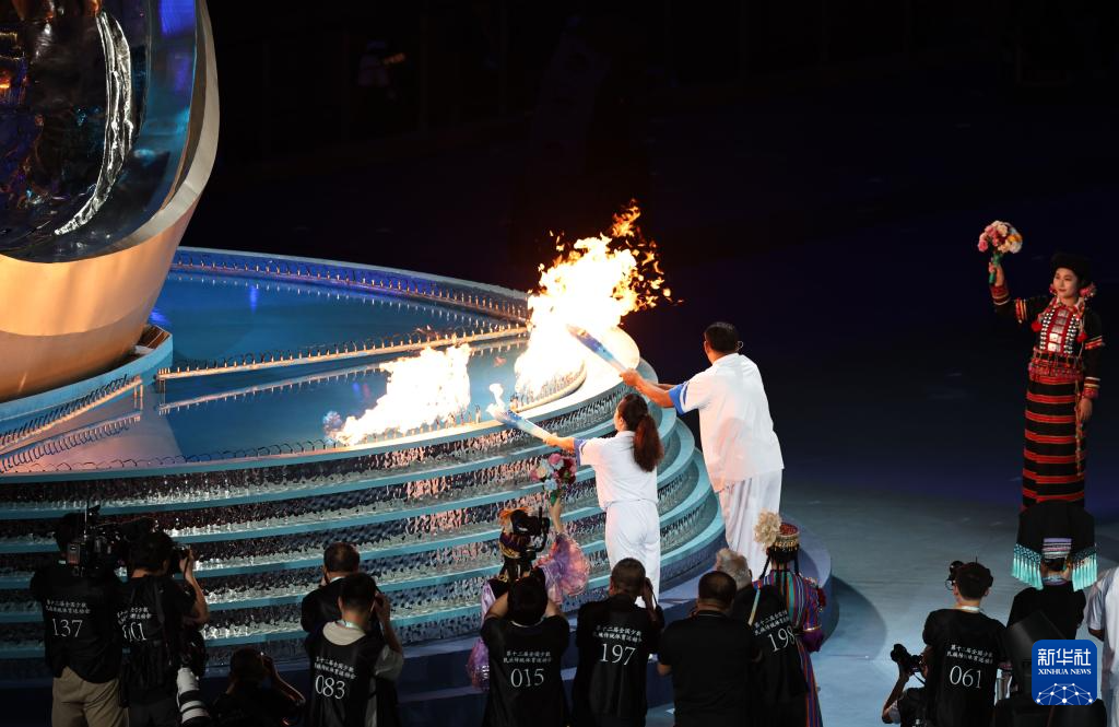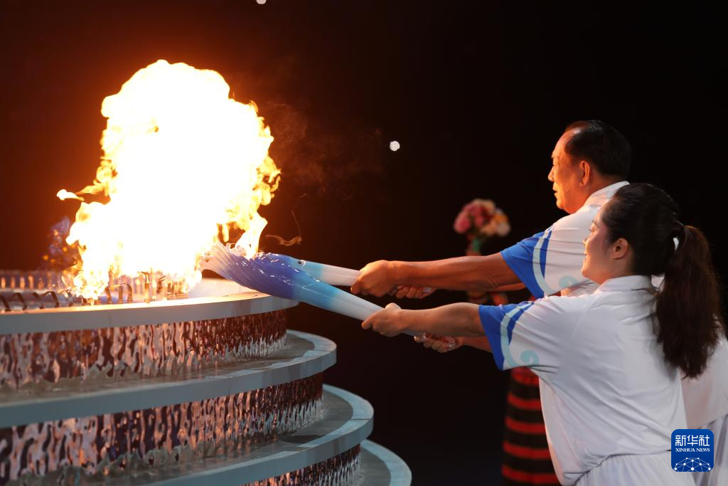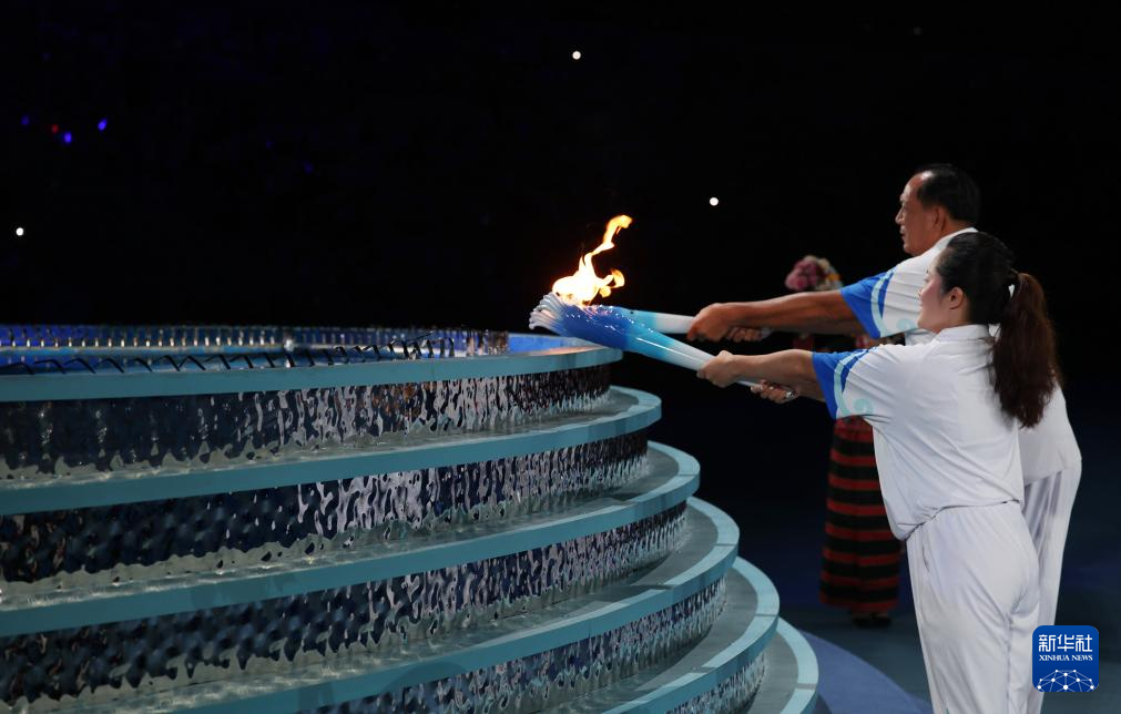 11月22日,火炬手符攀婵(前)与王书茂在开幕式上点燃主火炬。