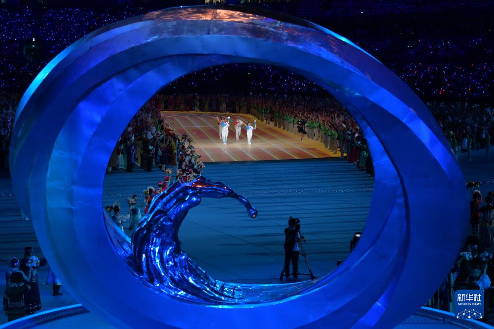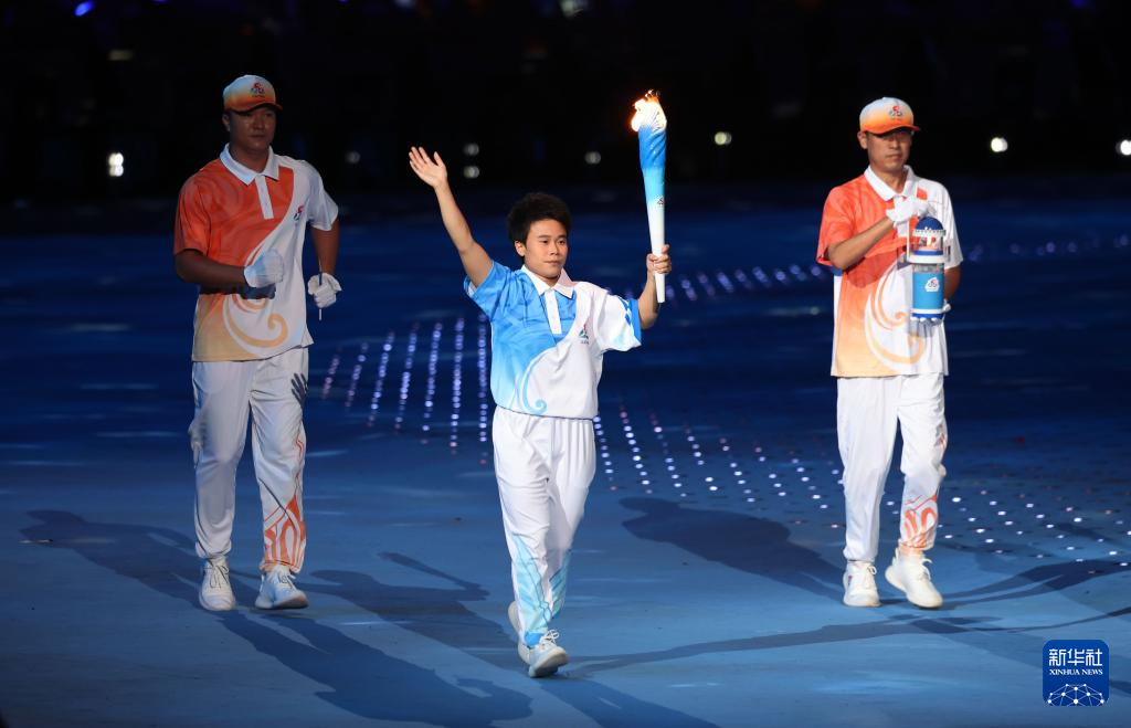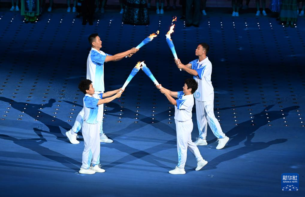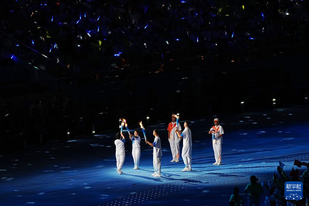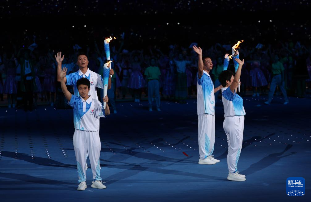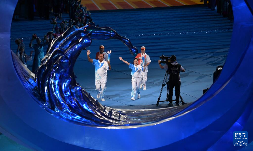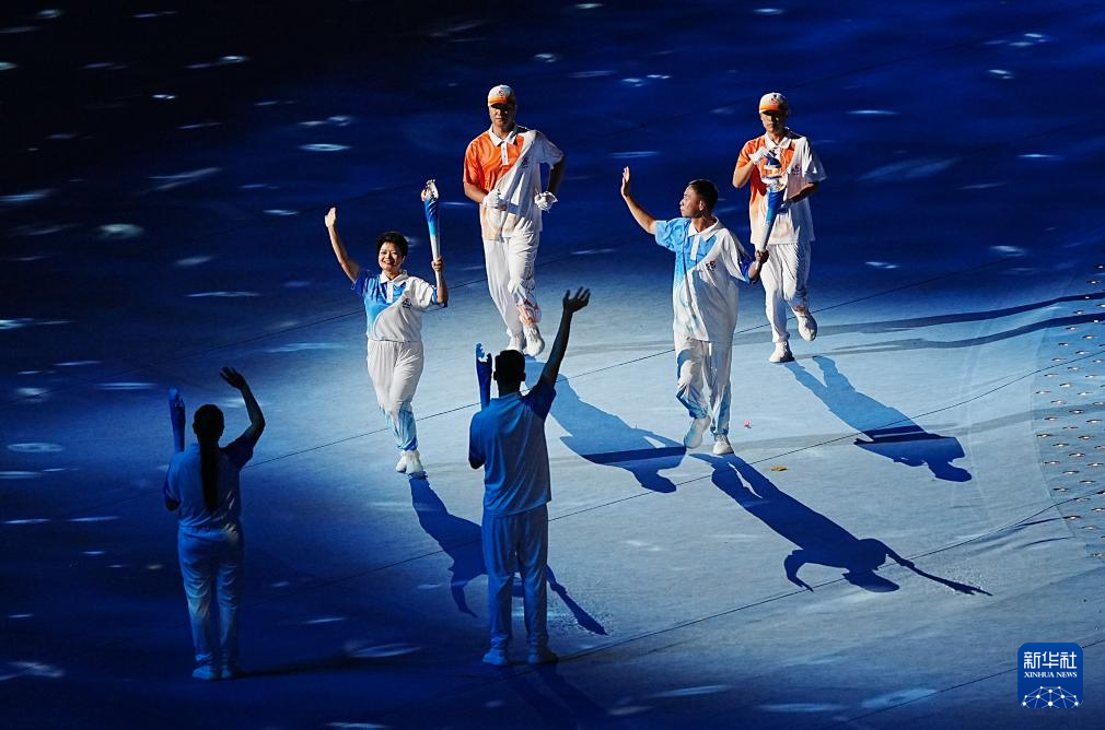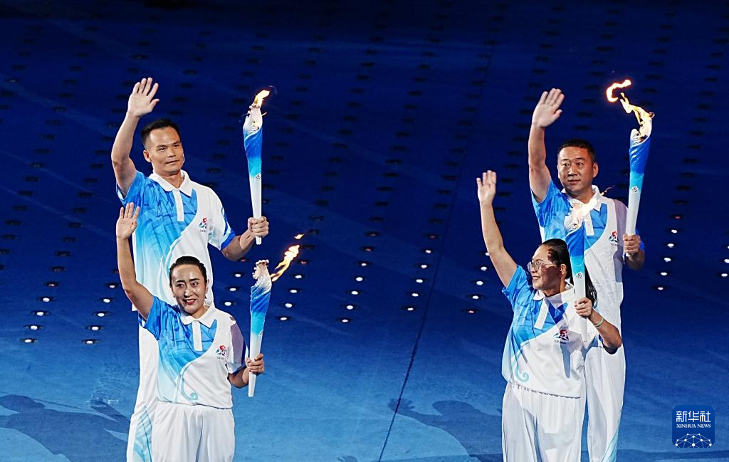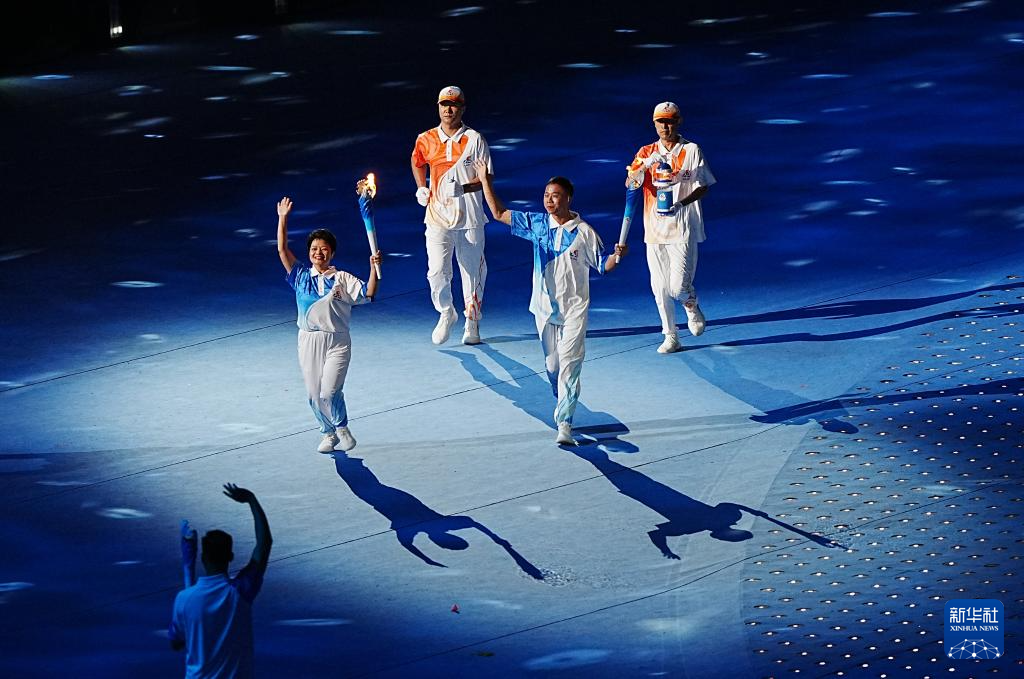 11月22日,火炬手符攀婵(右一)与王书茂(右三)在开幕式上传递火炬。