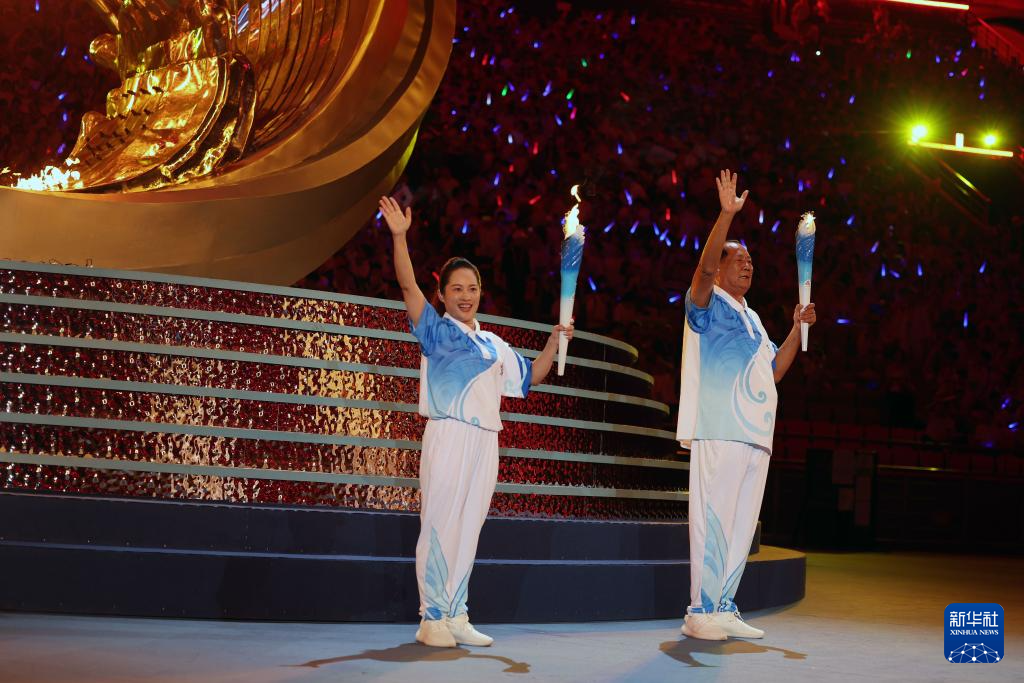 11月22日,火炬手符攀婵(左)与王书茂在开幕式上。