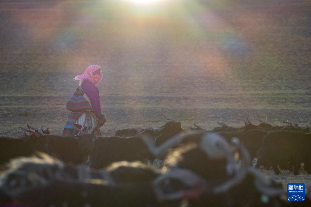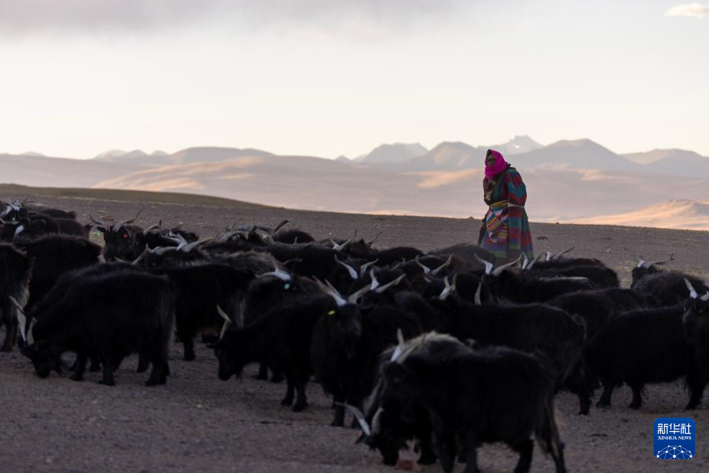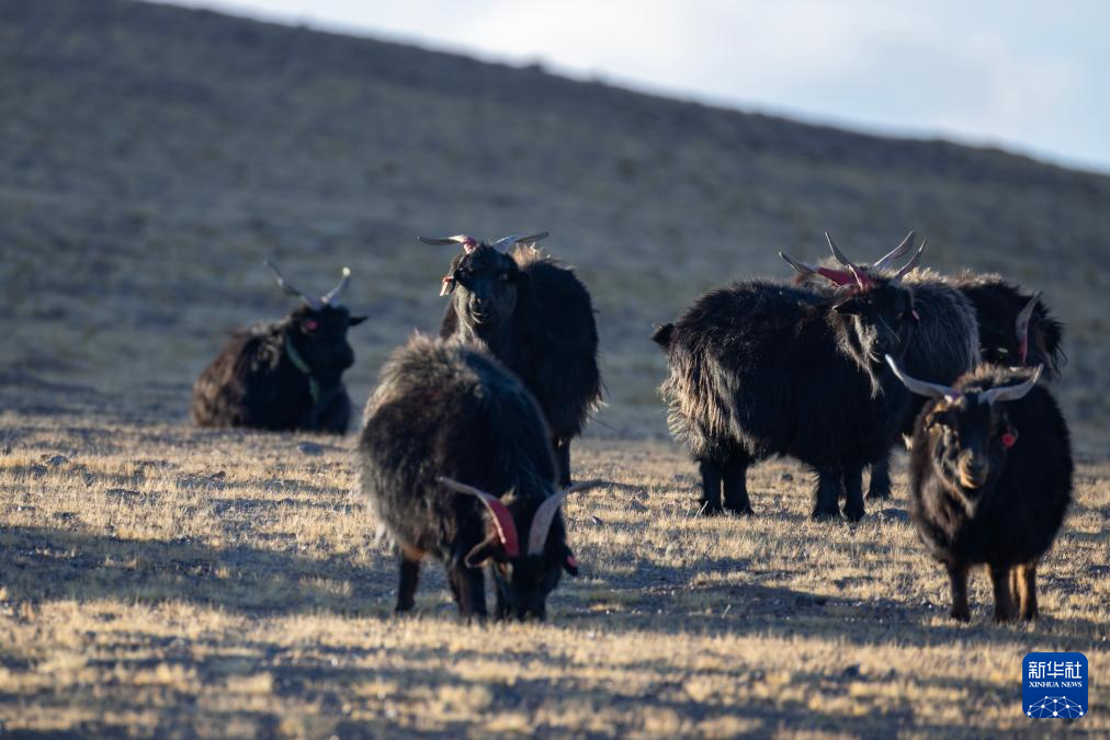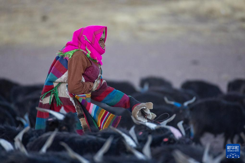 措勤县紫绒山羊原种场的一位牧工在照看优质种羊群(11月20日摄)。