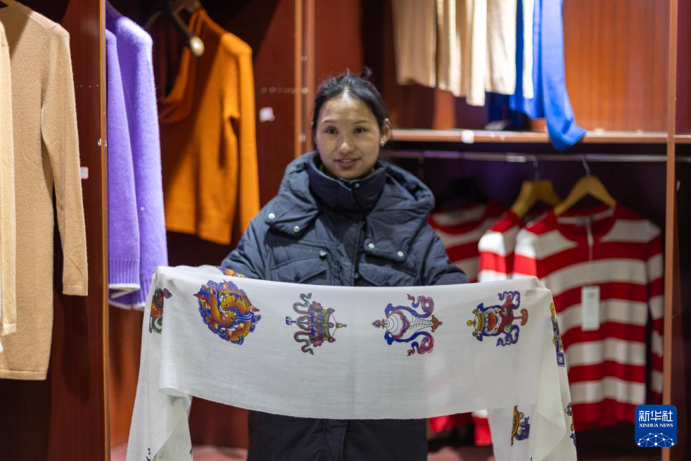 措勤县的销售人员在展示用紫山羊绒为原料制作的印有八宝图案的哈达(11月20日摄)。