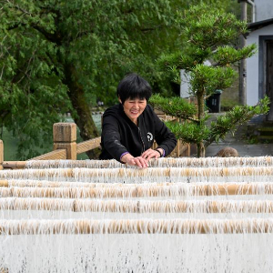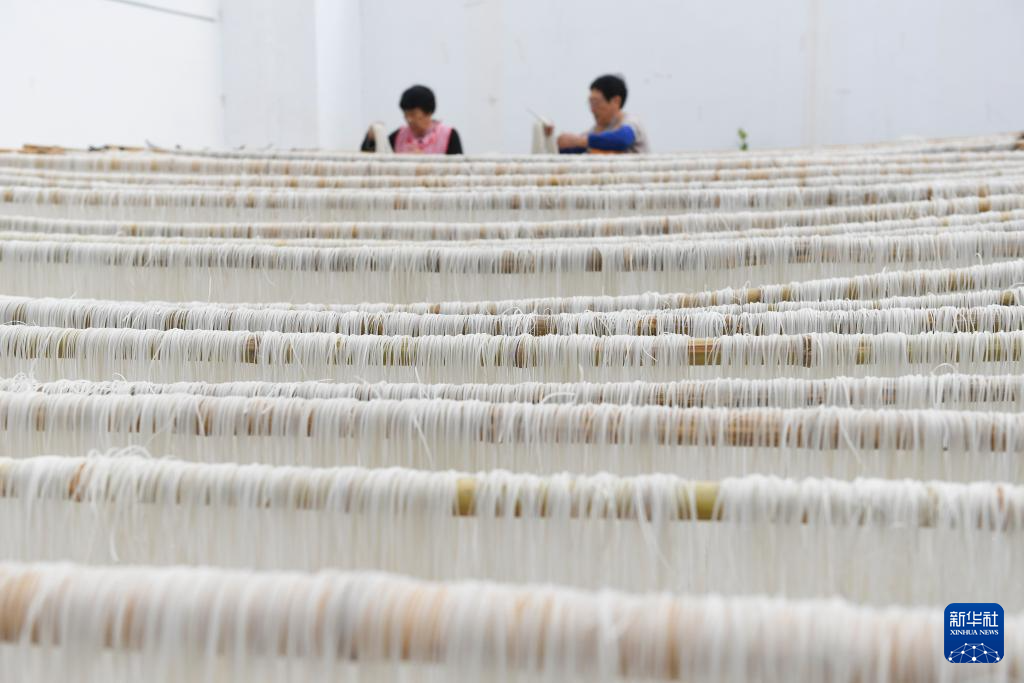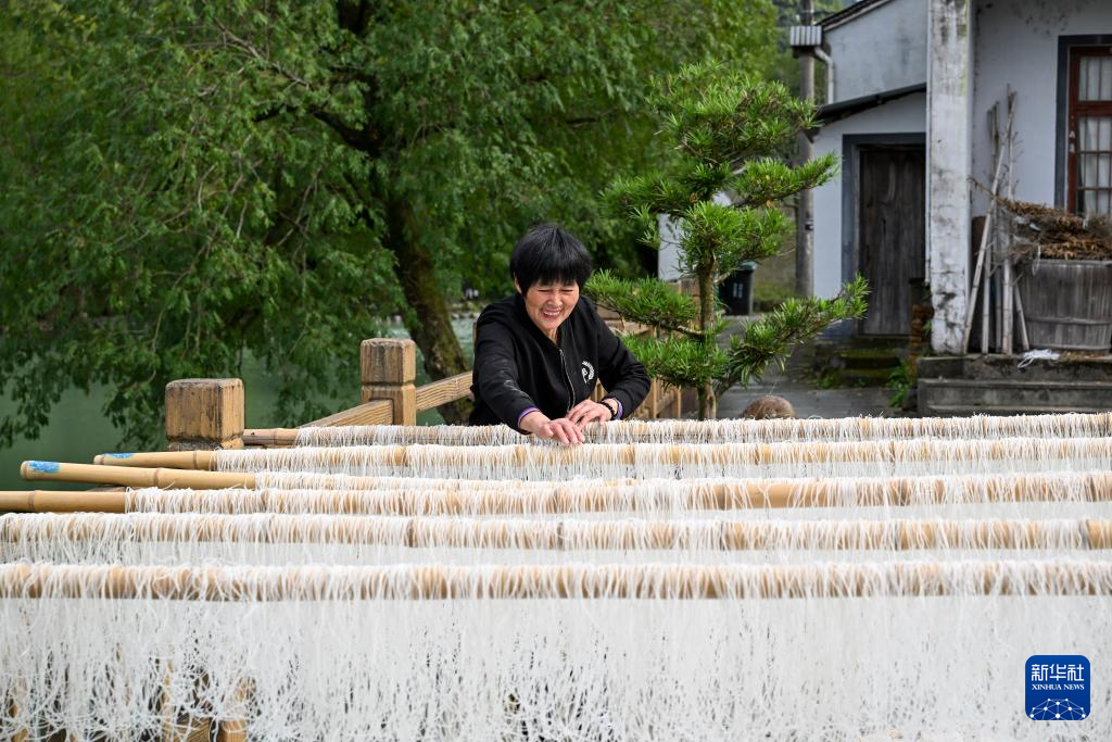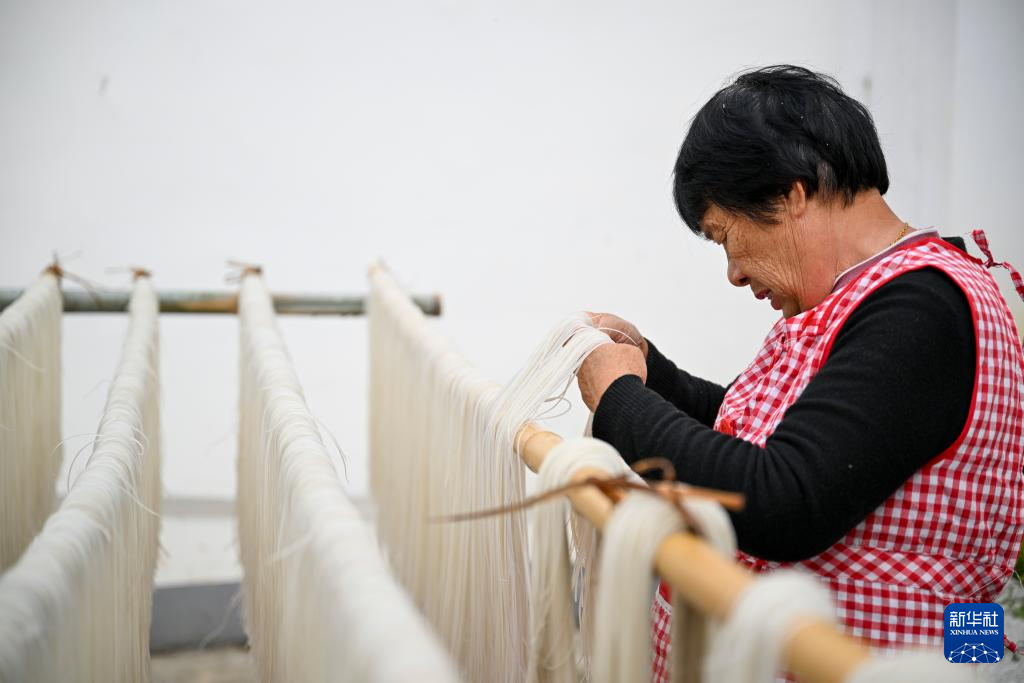 11月20日,在浙江余姚鹿亭乡中村的共富工坊,村民晾晒刚刚制成的番薯粉丝。