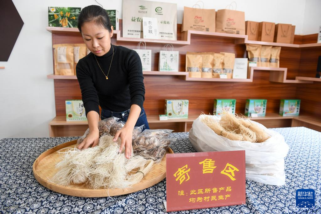 11月20日,在浙江余姚鹿亭乡的农合联中村服务社,工作人员整理村民寄售的粉丝和笋干等产品。