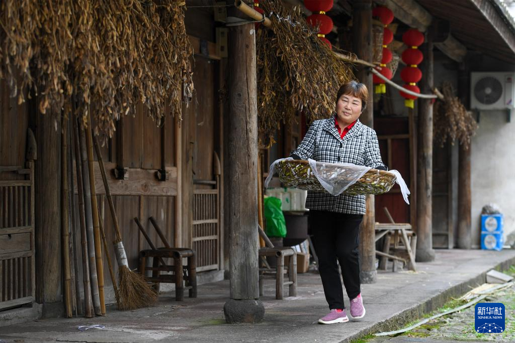 11月20日,在浙江余姚鹿亭乡“鹿亭农合”共富工坊,村民在晾晒番薯粉丝。