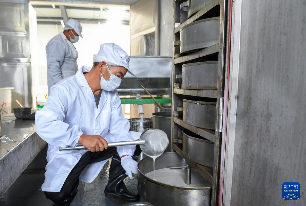 11月20日,在浙江余姚鹿亭乡中村的共富工坊,村民将番薯浆倒入蒸屉。