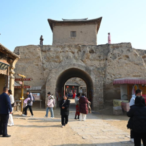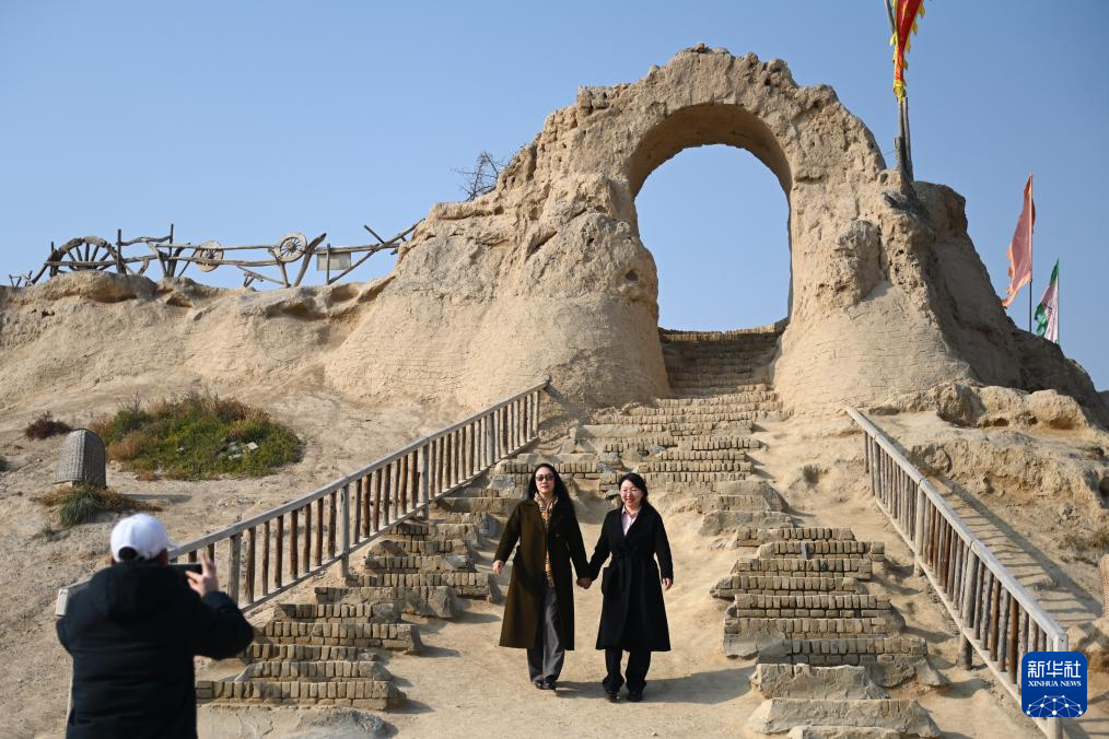 11月23日,在镇北堡西部影城,游客在电影《红高粱》取景地“月亮门”前拍照。