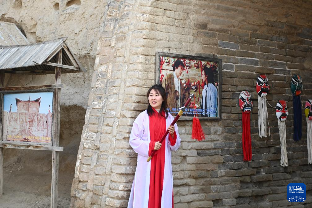 11月23日,游客在镇北堡西部影城身穿电影角色服装打卡拍照。