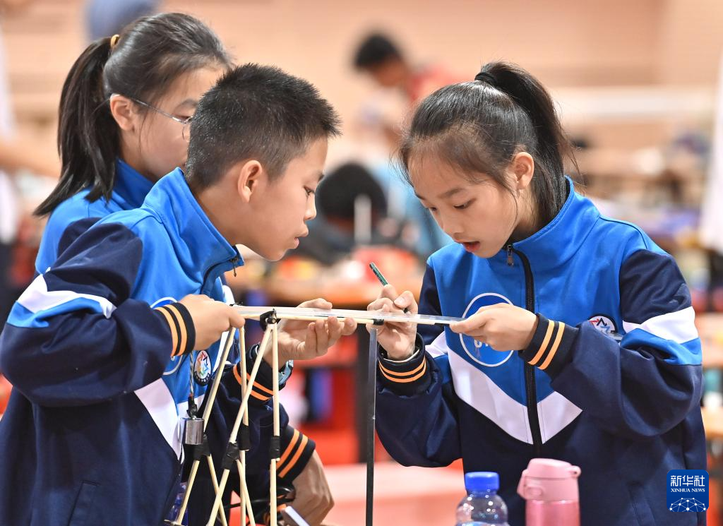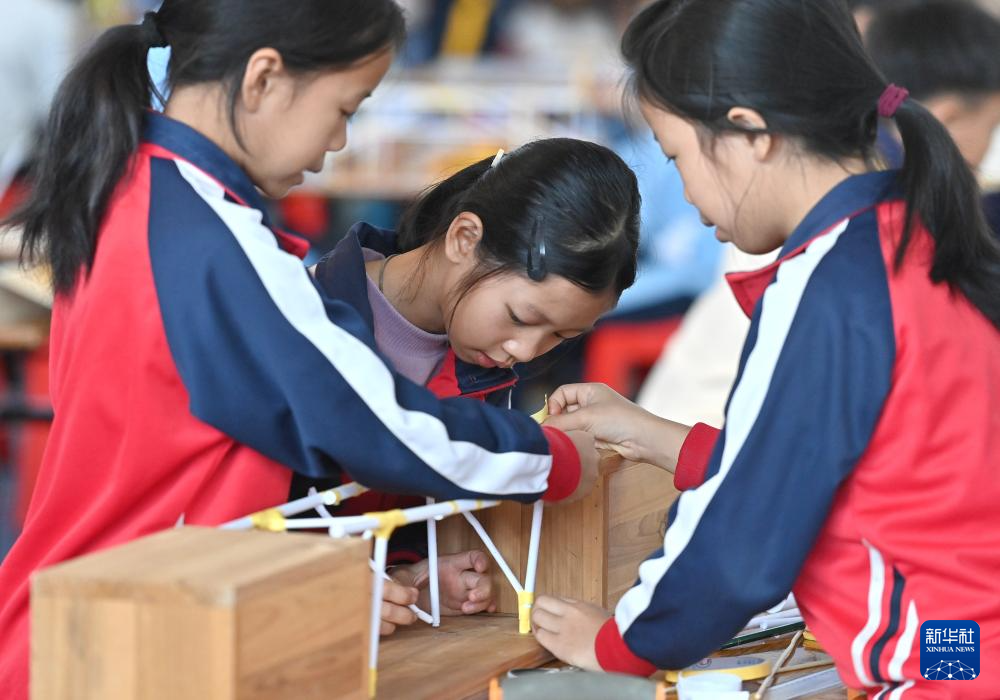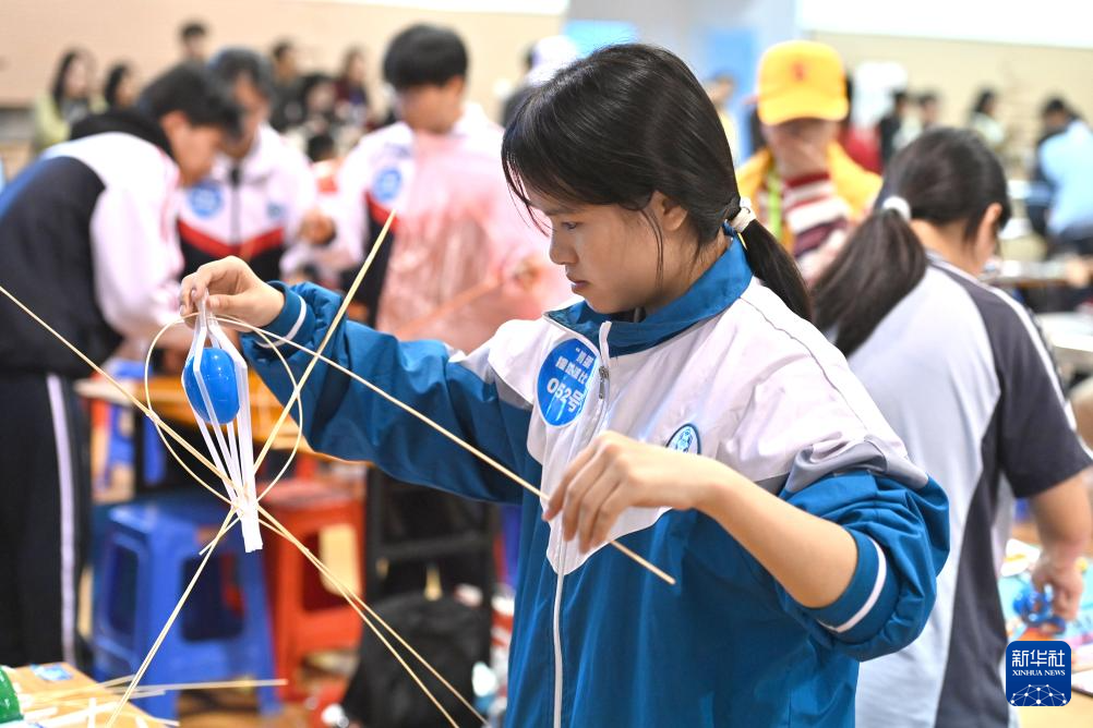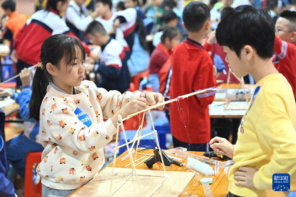 11月23日,选手在制作承重纸桥。