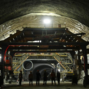 11月24日,工人从胶州湾第二隧道TJ-02标段一处施工点经过。