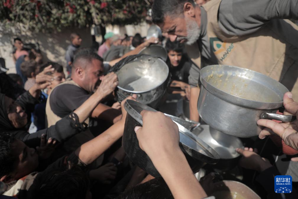 11月23日,巴勒斯坦人在加沙地带中部代尔拜拉赫领取救济食物。