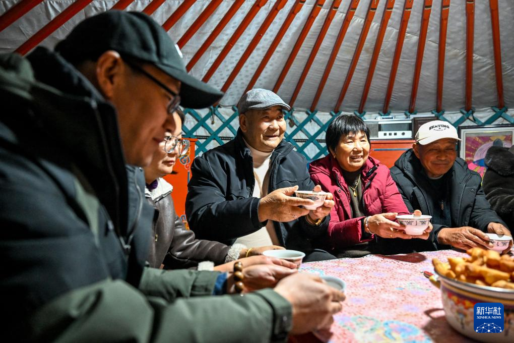 11月24日,杭巧云(右二)一家来到扎拉嘎木吉长期生活的四子王旗脑木更苏木,在蒙古包里喝奶茶。