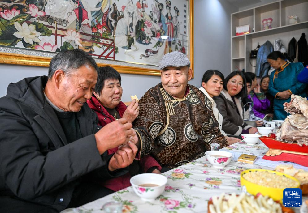 11月23日,扎拉嘎木吉(左三)给姐姐、姐夫分发奶食。