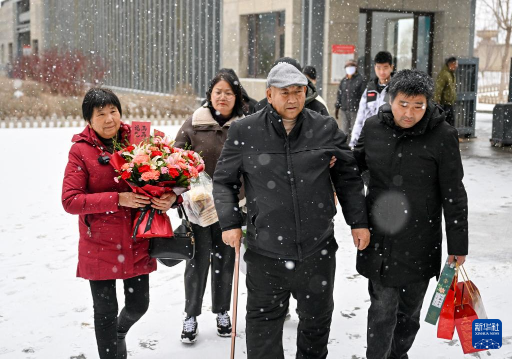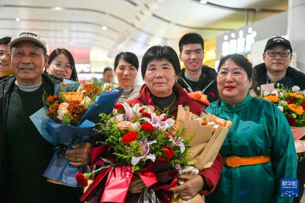 11月23日,杭巧云(前中)一家人抵达呼和浩特白塔机场,扎拉嘎木吉的大女儿(前右)前往迎接。