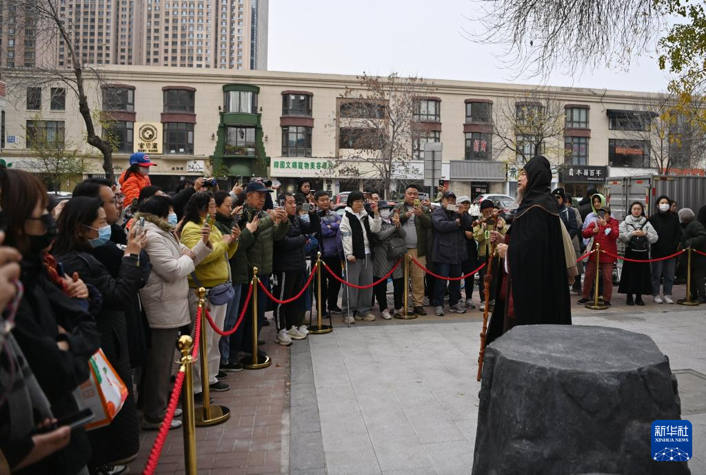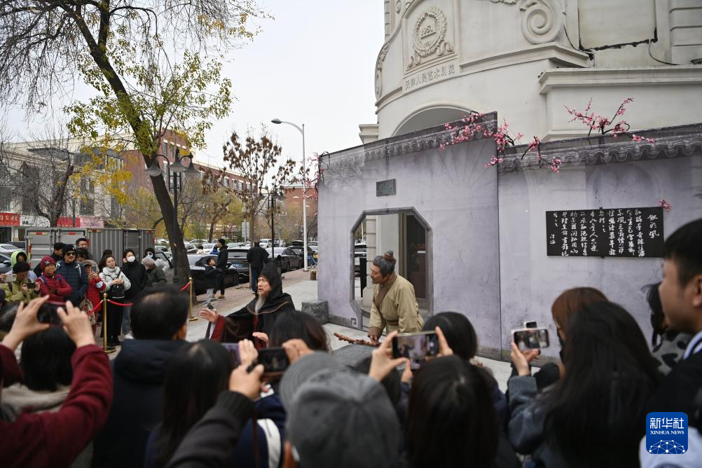 当日,天津人民艺术剧院经典话剧《钗头凤》片段在剧院门口的街角上演,让市民游客感受天津城市文化魅力。据了解,话剧《钗头凤》讲述了诗人陆游的一段人生经历。